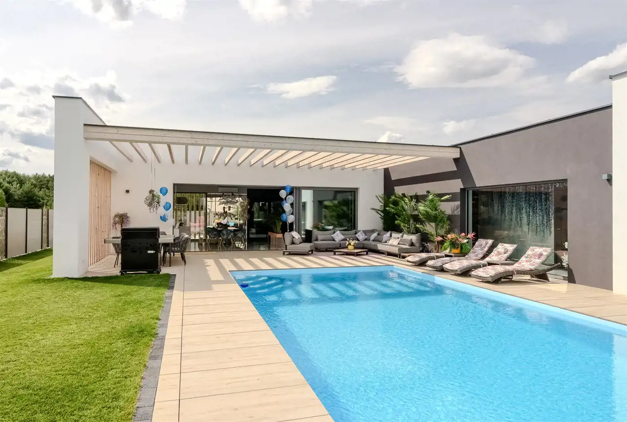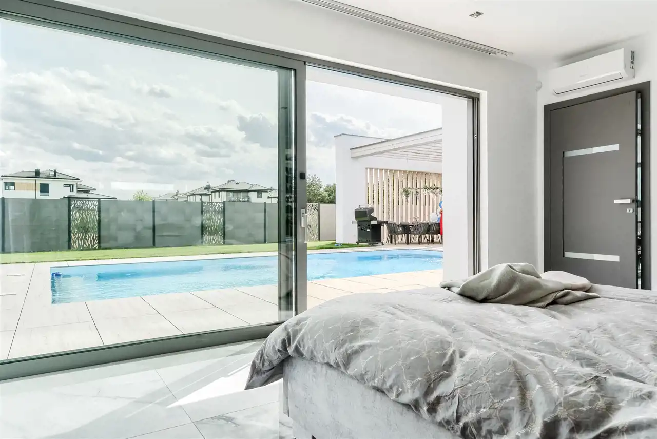 Ogromne panoramiczne okna zapewniają idealne doświetlenie wnętrz oraz zapewniają piękny widok na ogród z basenem i część rekreacyjną.