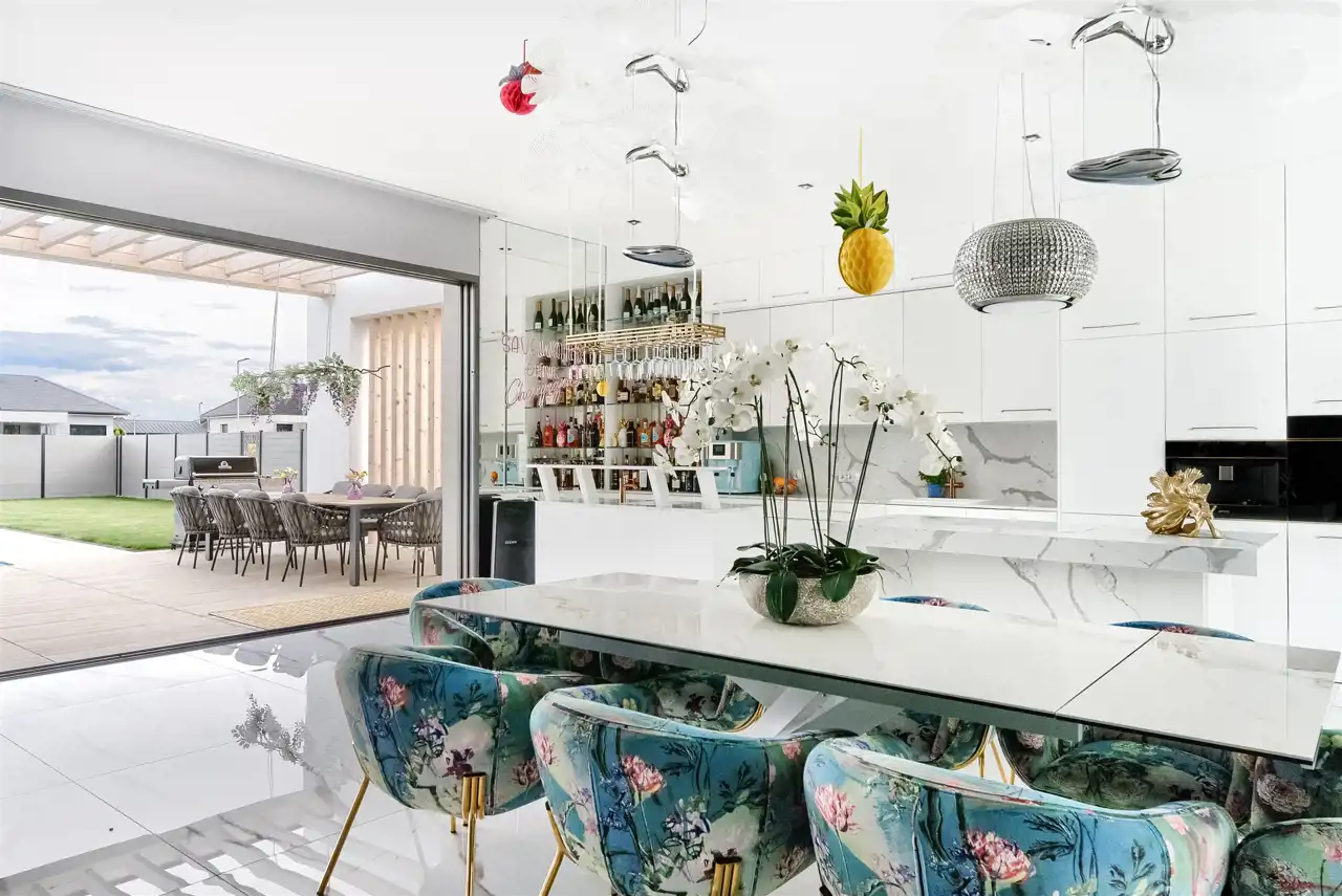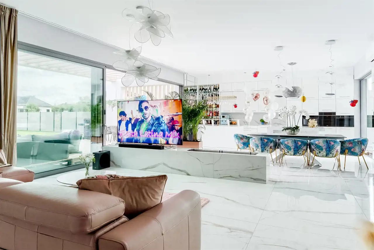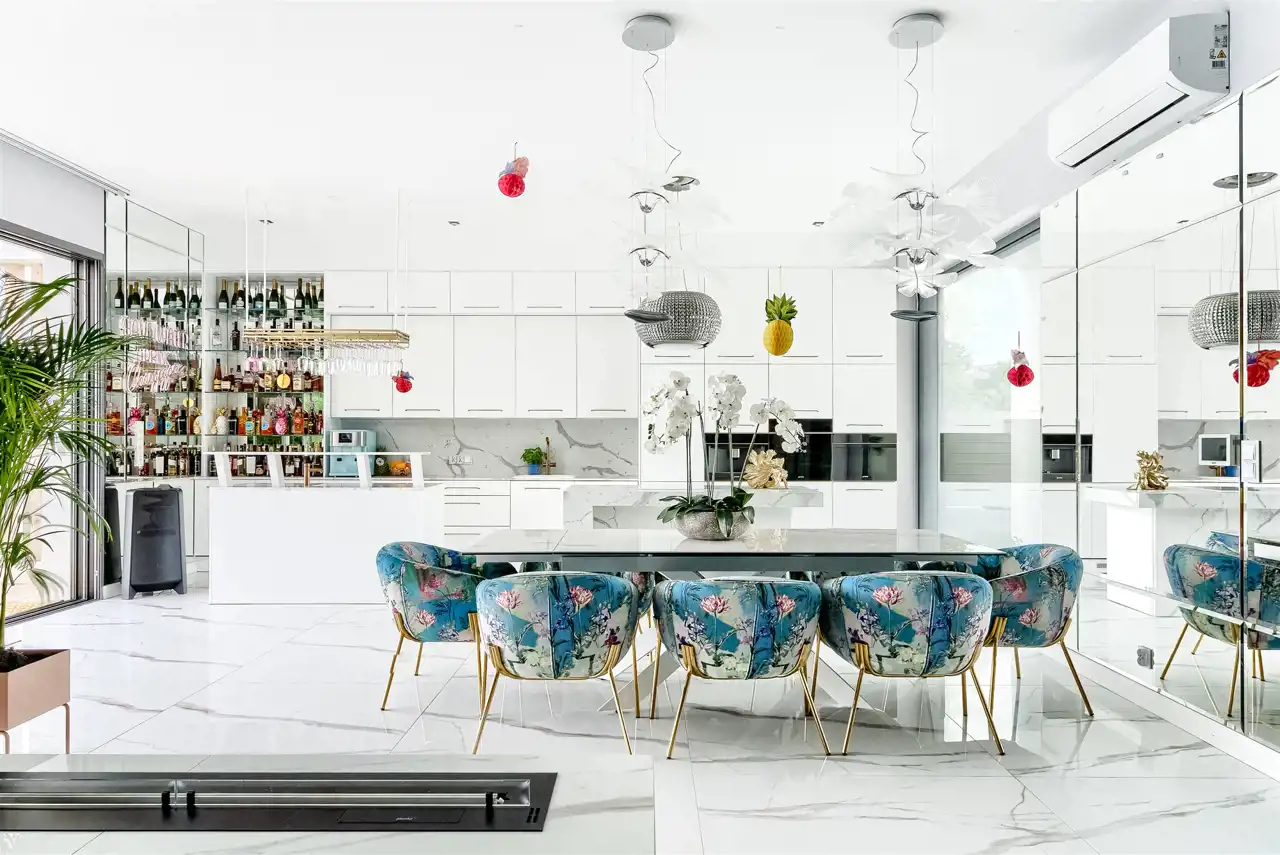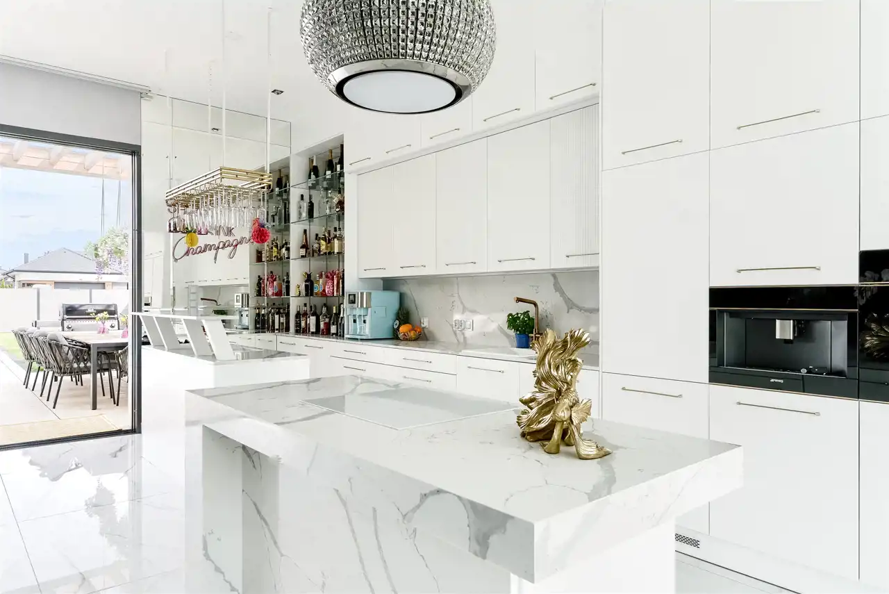 Nowoczesna zabudowana kuchnia ze sprzętem AGD marki SMEG, blaty wykonane ze spieków kwarcowych, bateria kuchenna z filtrem i opcją wody gazowanej, okap kuchenny Interstellar Elica, halogeny Swarovski.