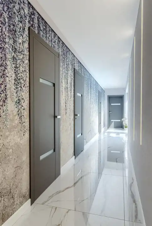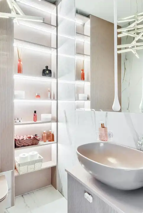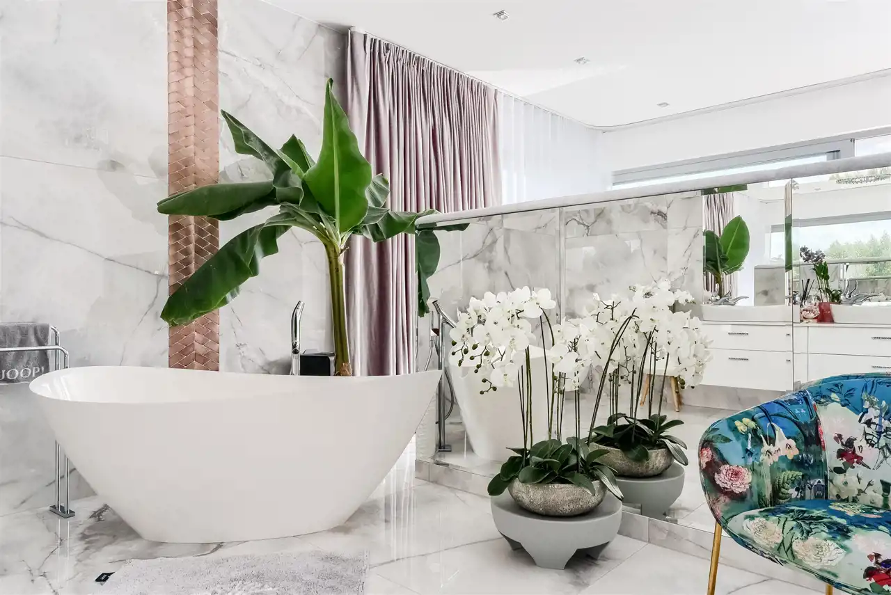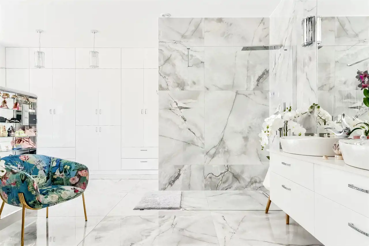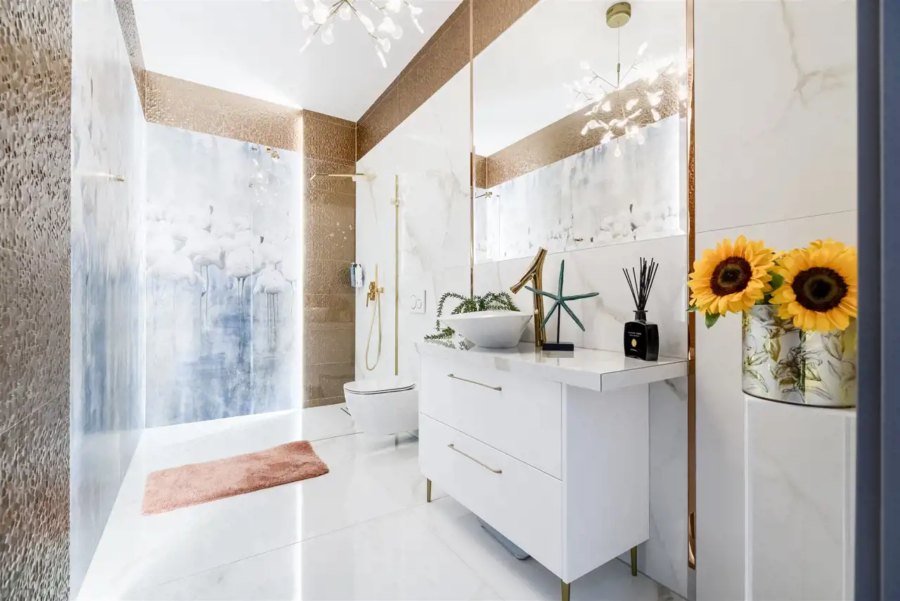 Łazienki utrzymane w jasnej kolorystyce, płytki ze wzorem marmuru oraz dodatkowo płytki dekoracyjne Wall Art.