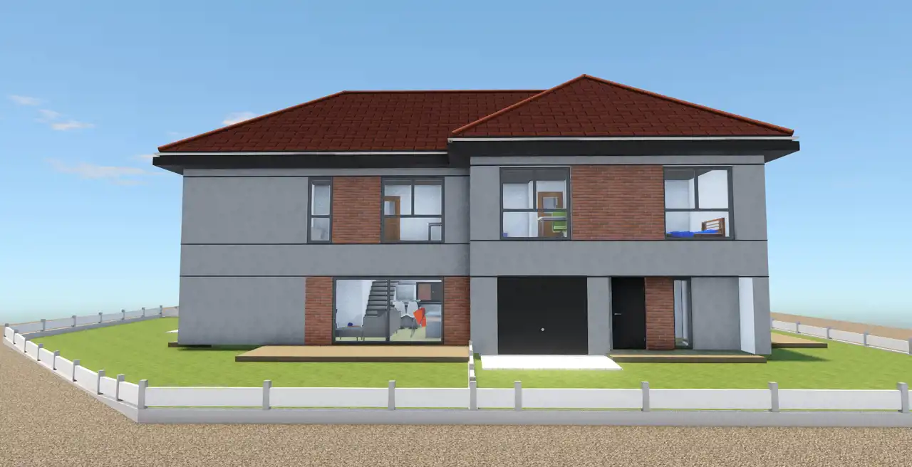 Dom charakteryzuje się nowoczesną architekturą Wykonany został przy użyciu dobrych jakościowo materiałów, z wykorzystaniem metalu i szkła.
