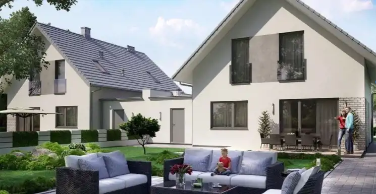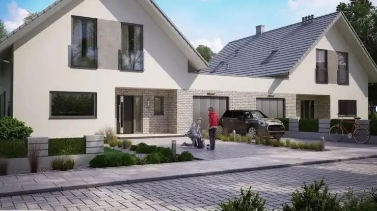Dom w zabudowie bliźniaczej , budynki połączone garażami co daje i zapewnia komfort niezależności jak w domu wolnostojącym