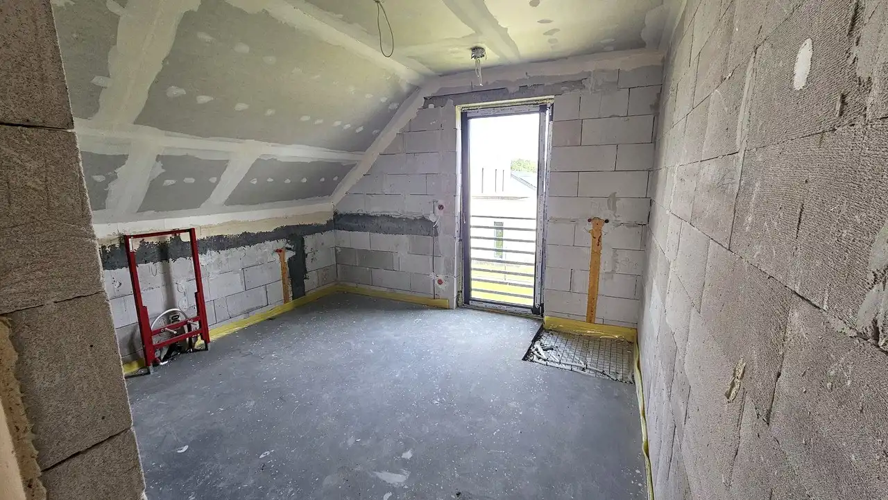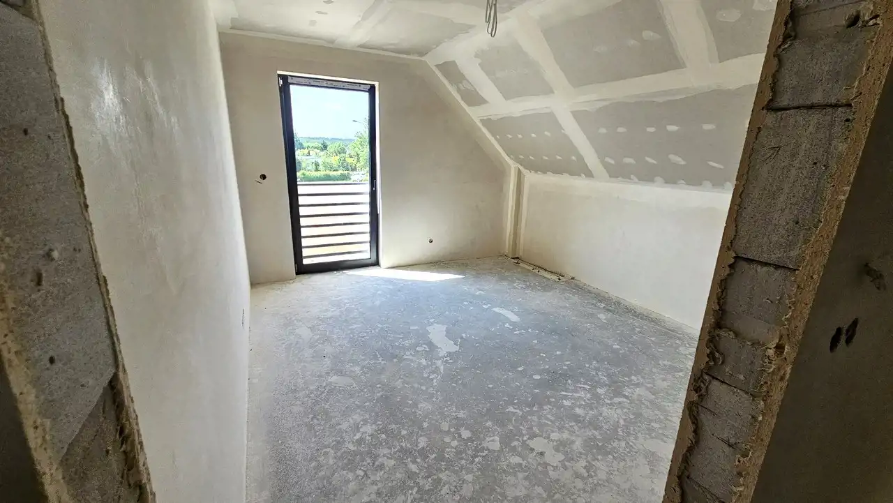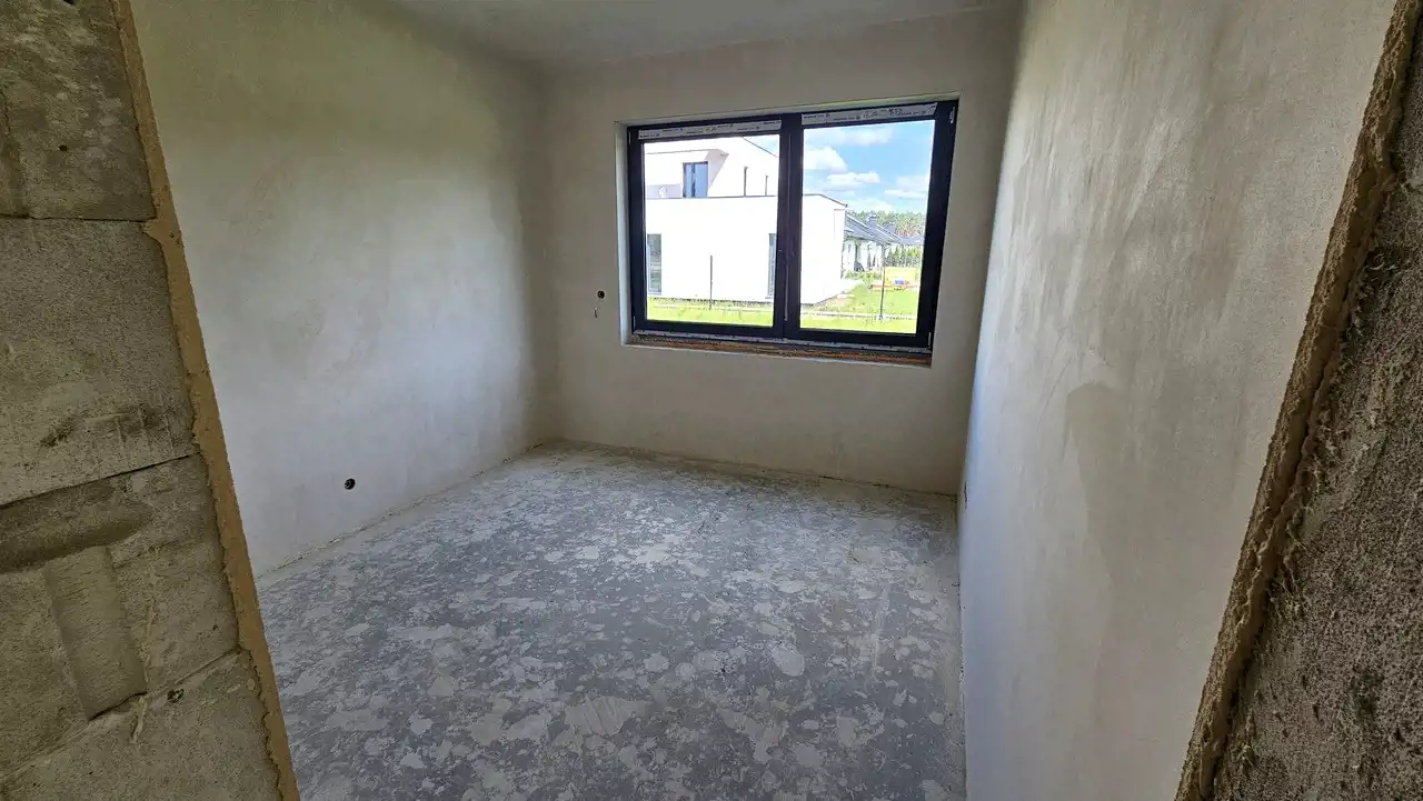 Dom w stanie deweloperskim. Dach wykonany z dachówki betonowej, rynny metalowe. Docieplony styropianem. Posiada taras. Prąd, woda na działce. Ogrzewanie - pompa ciepła. Ogrzewanie podłogowe. Duży salon z aneksem kuchennym plus 4 pokoje. 2 łazienki z WC. Kotłownia. Nie podpiwniczony. Okna PCV. Schody do wykonania. Taras. Budynek doskonale docieplony. Garaż. Alarm. Internet.