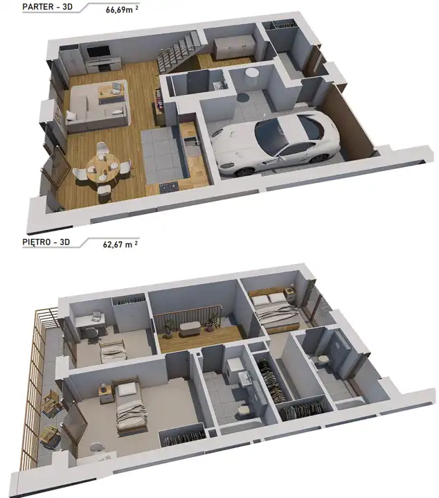 Domy charakteryzują się przemyślanym układem i przestronnymi pomieszczeniami.
