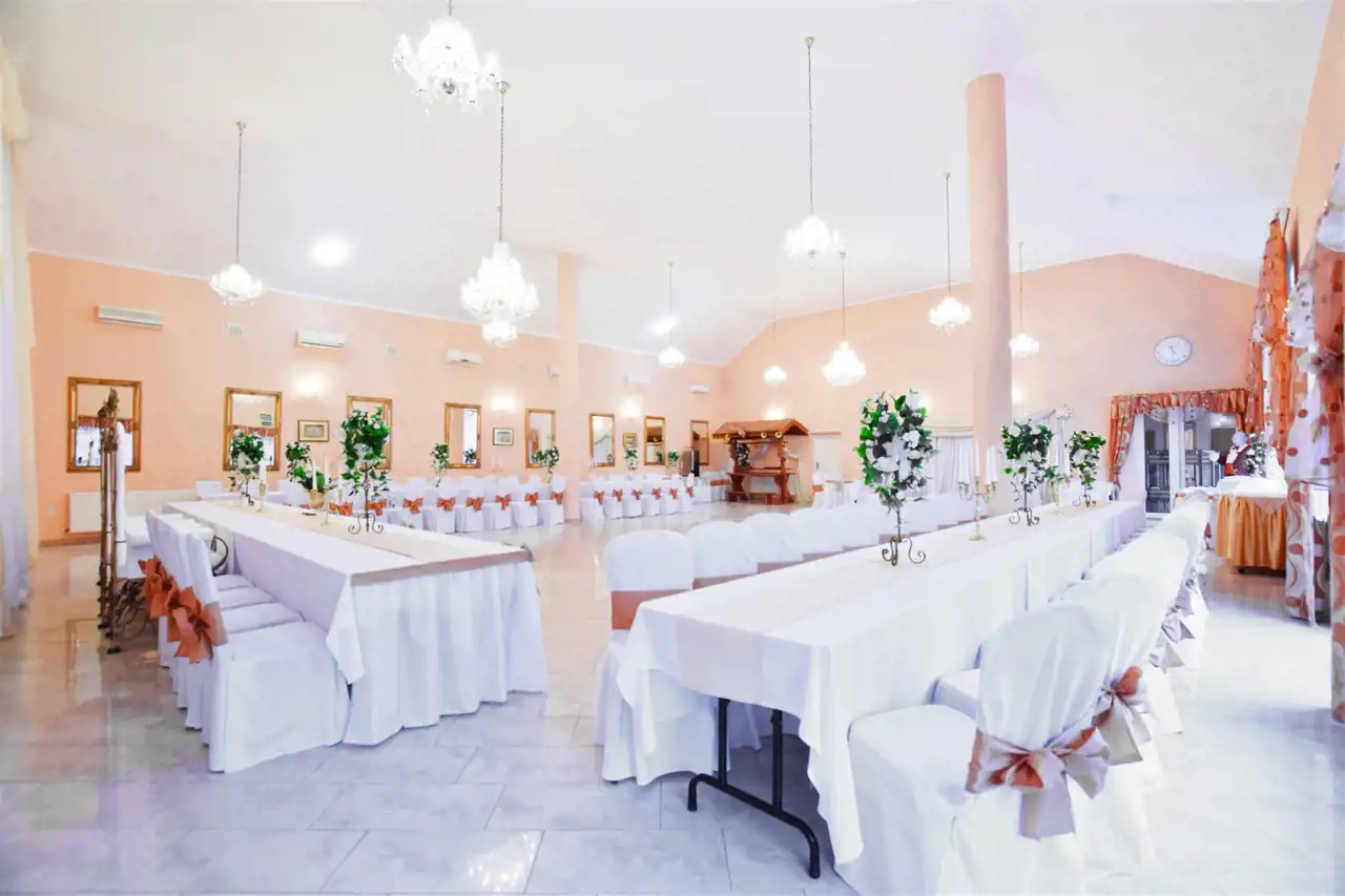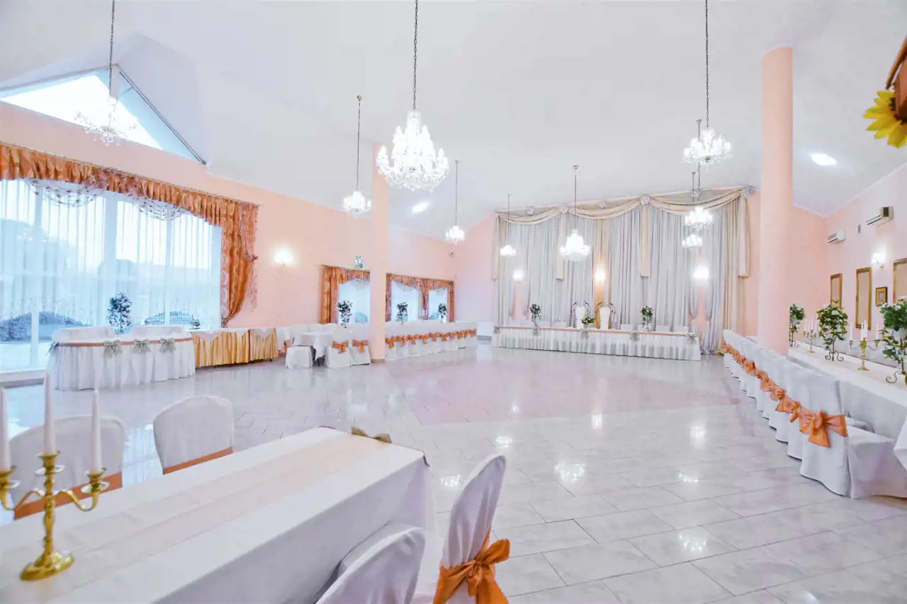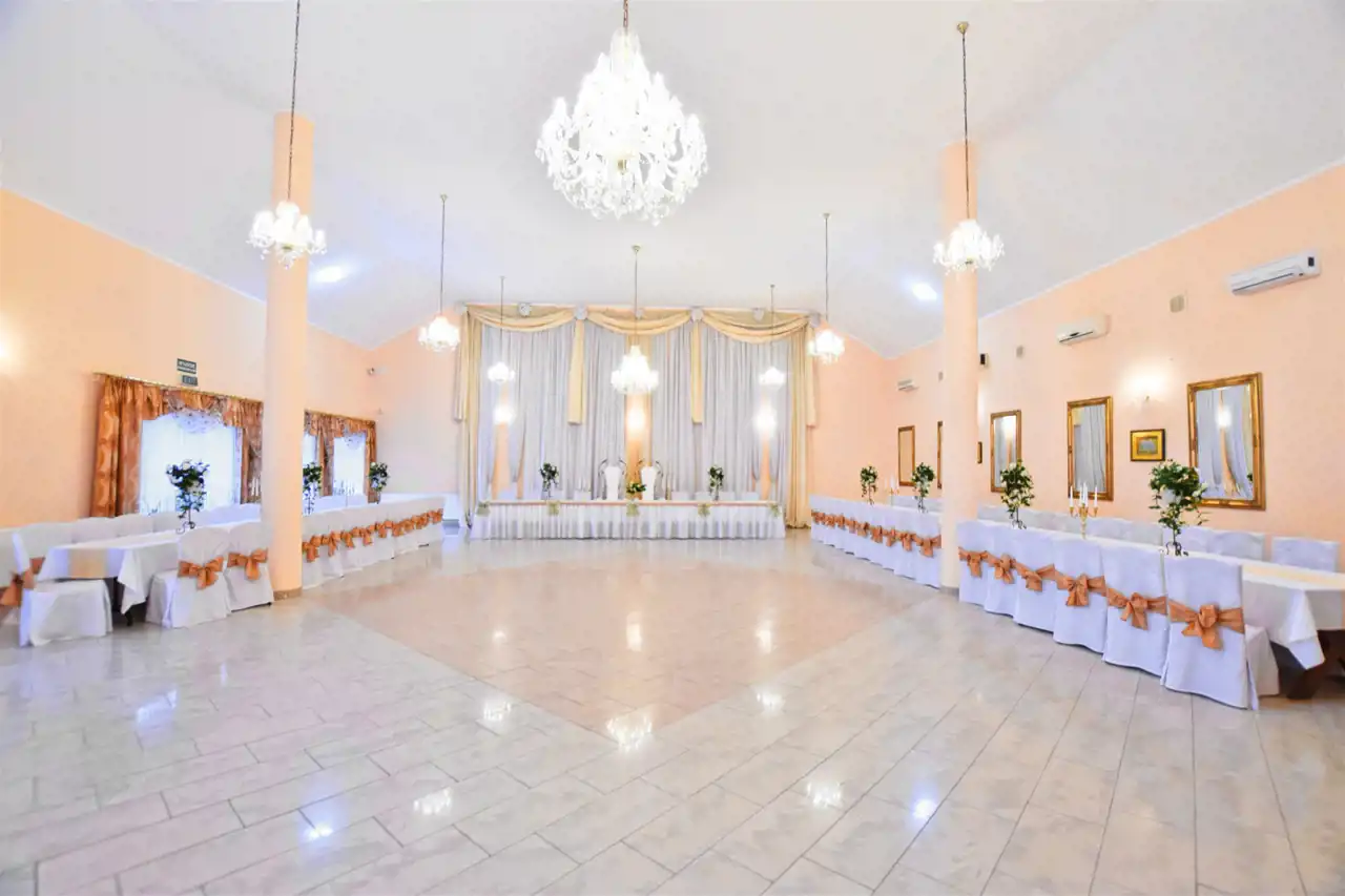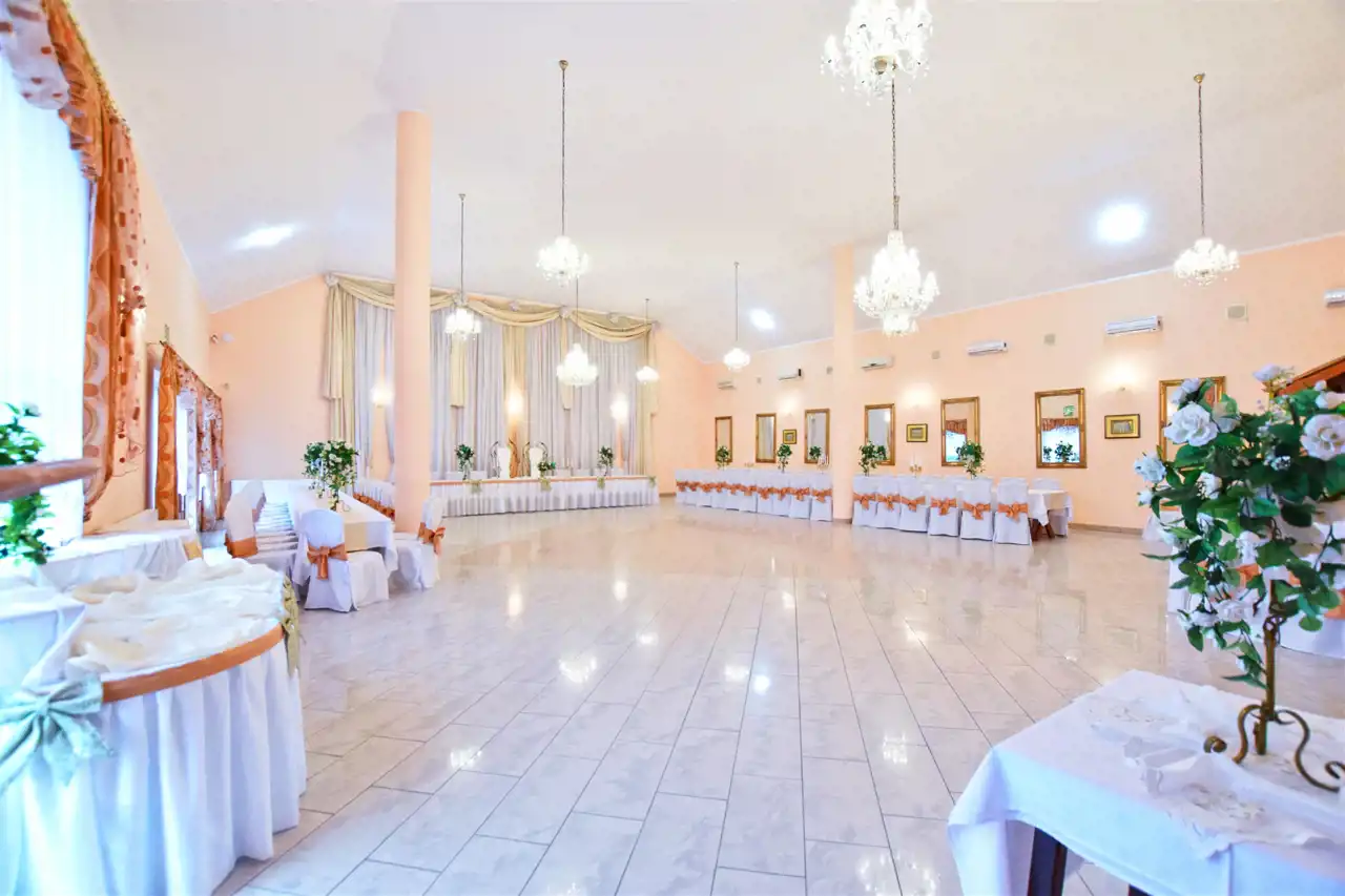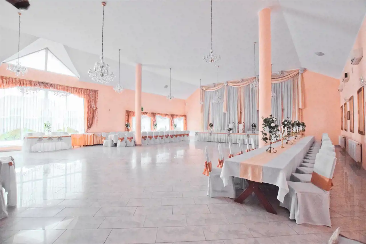 Najem obejmuje klimatyzowaną salę konferencyjno-bankietową o pow. 214 m2, która pomieści 115 gości weselnych (uwzględniając wydzielone miejsce do tańczenia), bądź 130 gości siedzących, ponadto na parterze: kuchnie, zmywalnie, magazyny spożywcze i alkoholowe, chłodnie, mrożnie, toalety pracownicze, toalety dla gości (w tym toaleta dla osób niepełnosprawnych), hol z szatnią; na piętrze 4 pokoje przygotowane na przyjęcie 17 osób, łazienka, toaleta.