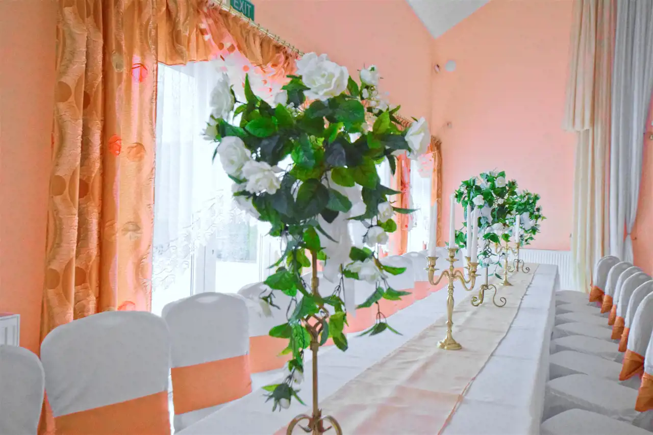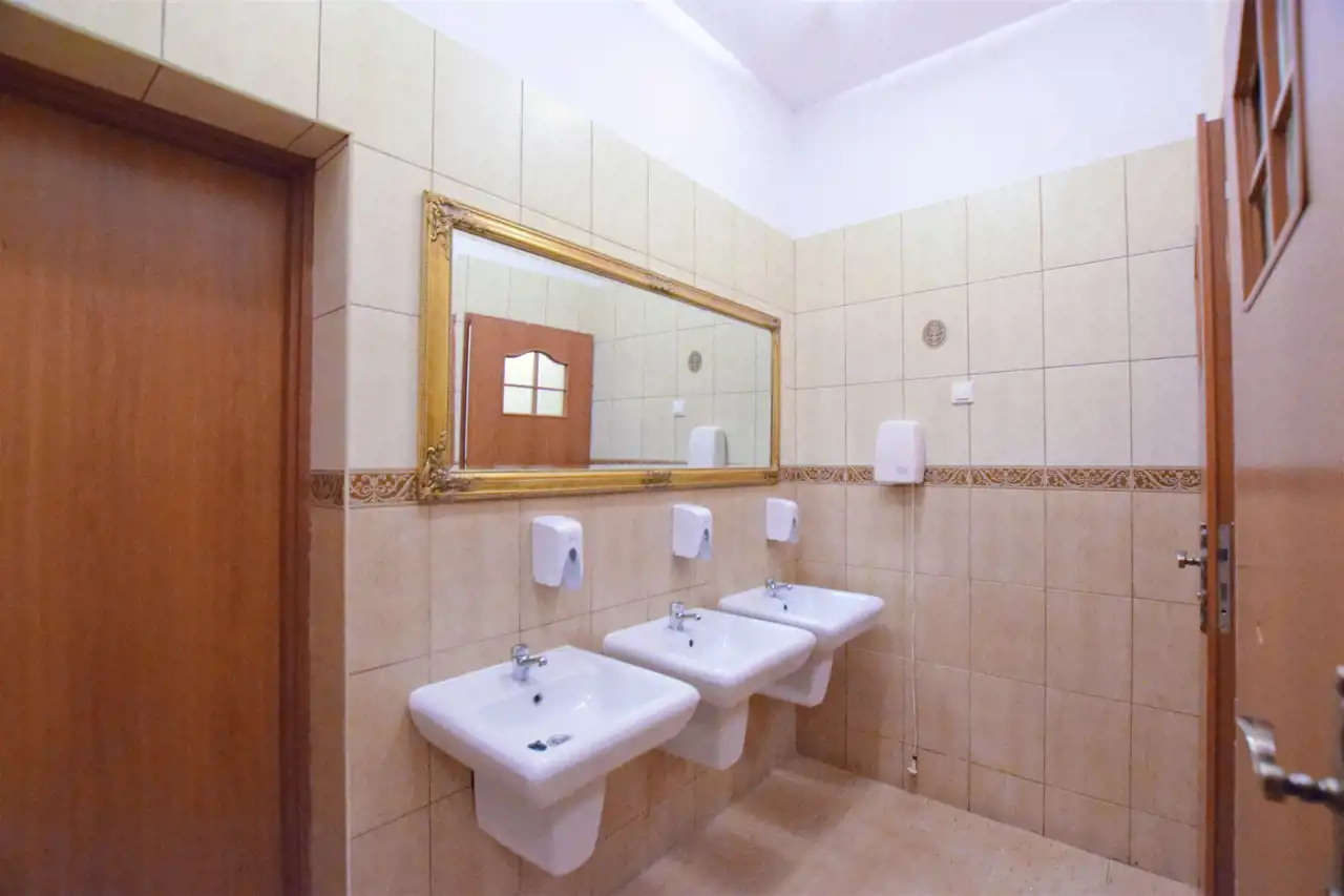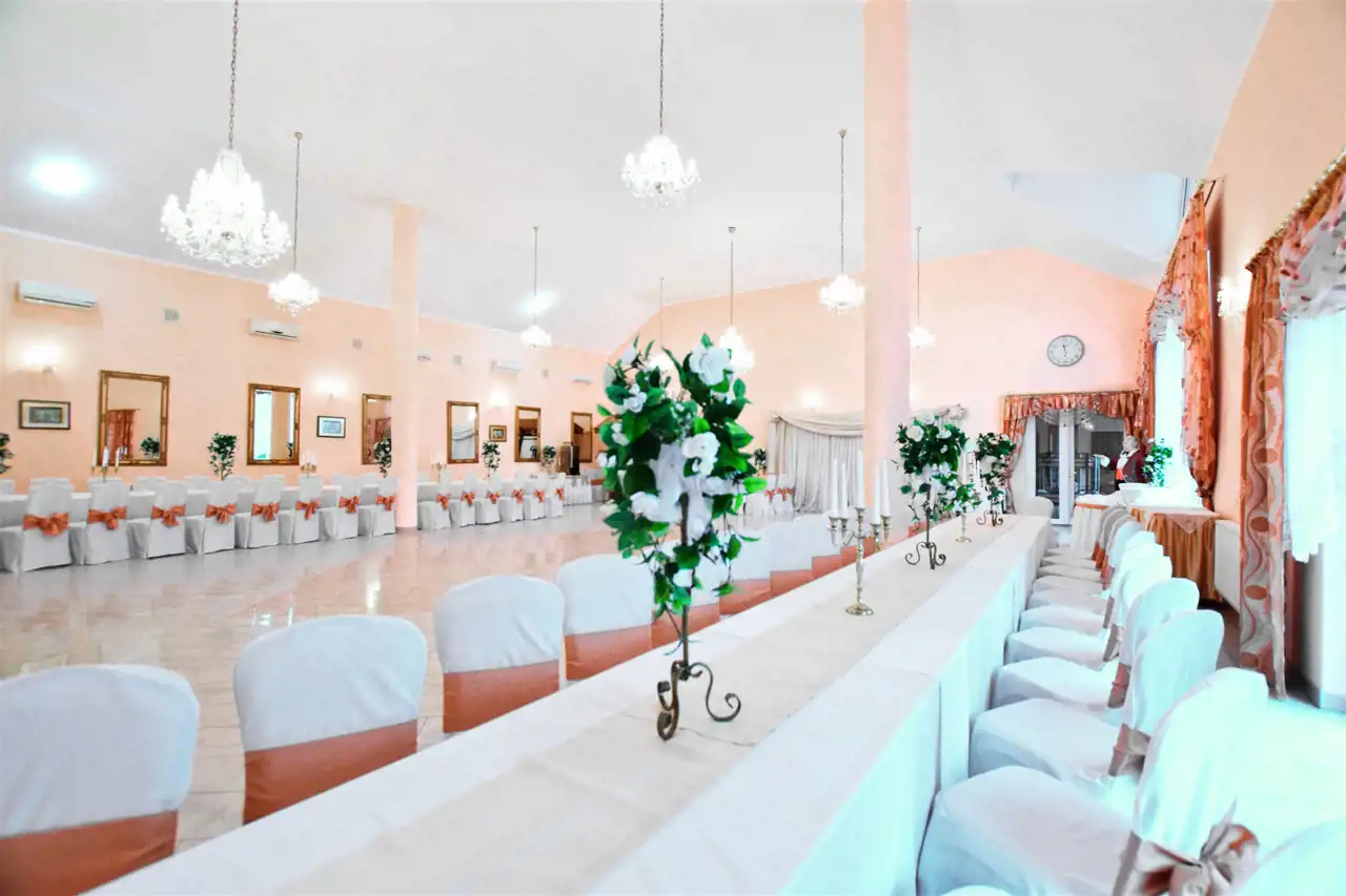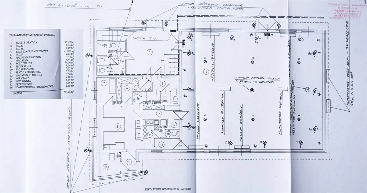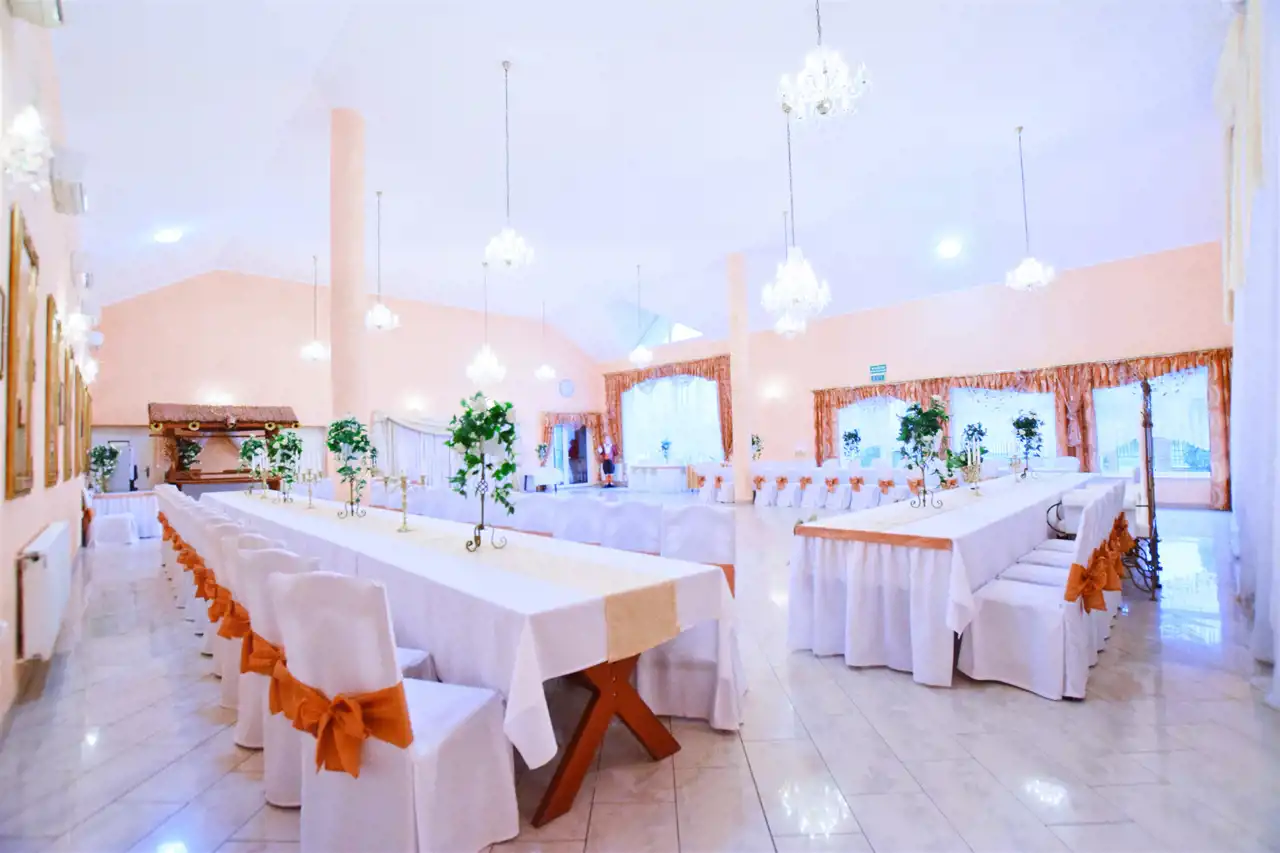 Najem obejmuje klimatyzowaną salę konferencyjno-bankietową o pow. 214 m2, która pomieści 115 gości weselnych (uwzględniając wydzielone miejsce do tańczenia), bądź 130 gości siedzących, ponadto na parterze: kuchnie, zmywalnie, magazyny spożywcze i alkoholowe, chłodnie, mrożnie, toalety pracownicze, toalety dla gości (w tym toaleta dla osób niepełnosprawnych), hol z szatnią; na piętrze 4 pokoje przygotowane na przyjęcie 17 osób, łazienka, toaleta.