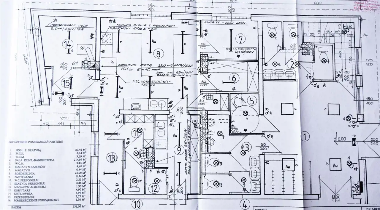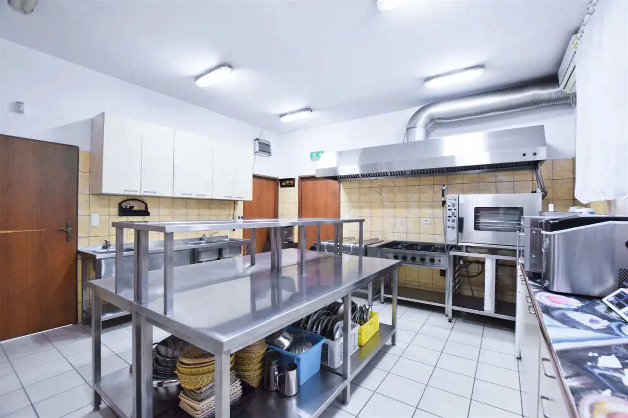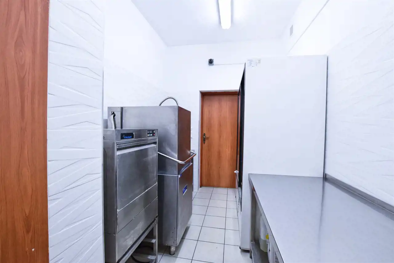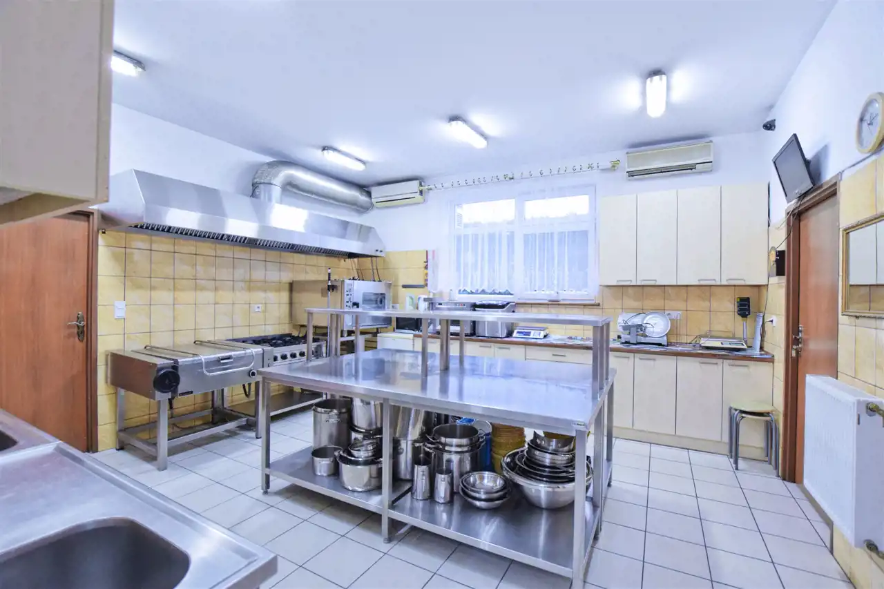 Zaplecze gastronomiczne wyposażone m.in. chłodnie, mrożnie, 2 wyparzarki, szafę chłodniczą, piec konwekcyjno-parowy, kuchenkę gazową 5-palnikową, mikrofalówkę itd.