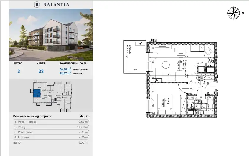 - Charakterystyka mieszkania 38.57 m2, 2 pokoje