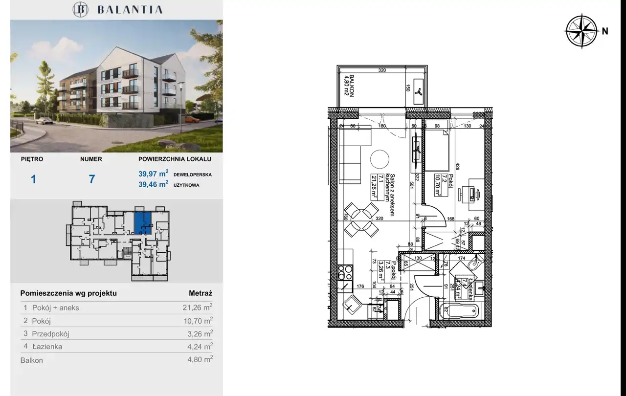 - Charakterystyka mieszkania 39.46 m2, 2 pokoje