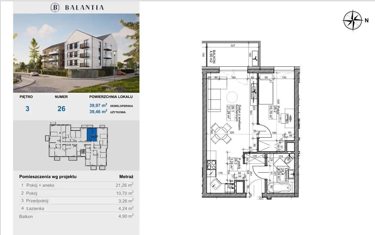 - Charakterystyka mieszkania 39.46 m2, 2 pokoje