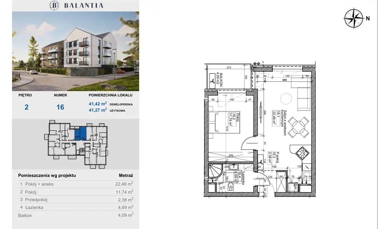 - Charakterystyka mieszkania 41.27 m2, 2 pokoje