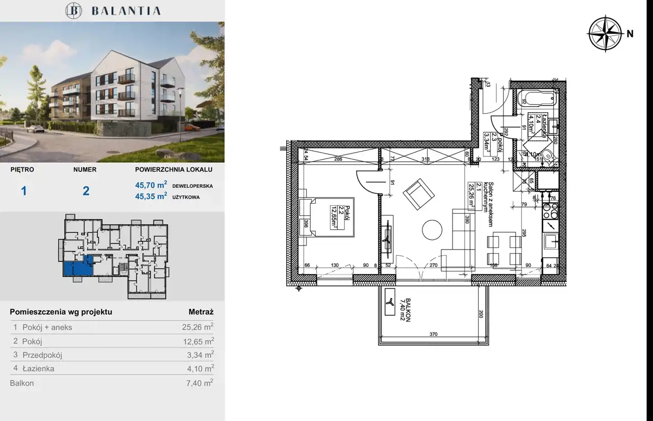 - Charakterystyka mieszkania 45.35 m2, 2 pokoje