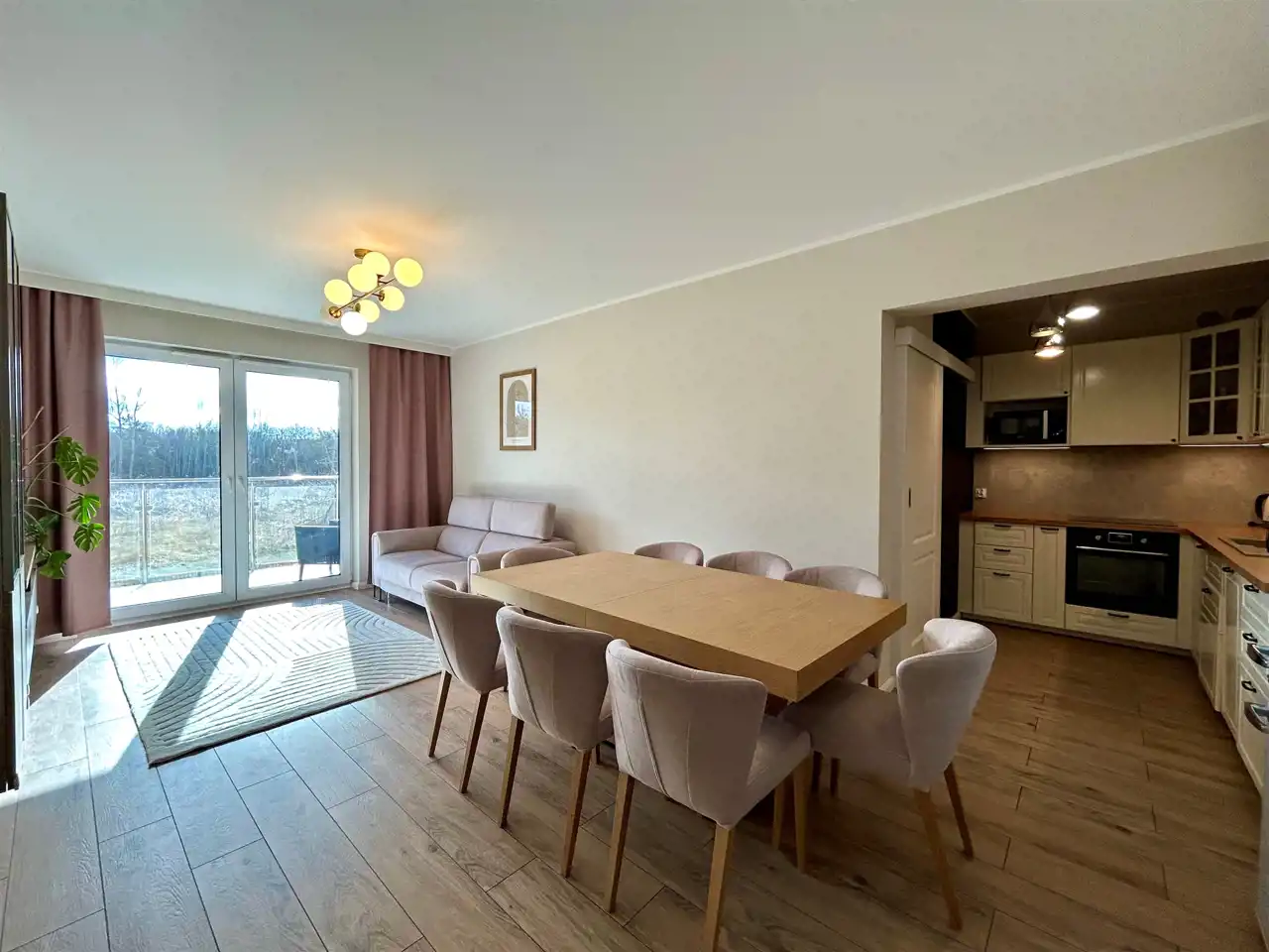 przestronny salon z aneksem kuchennym i wyjściem na przeszklony taras