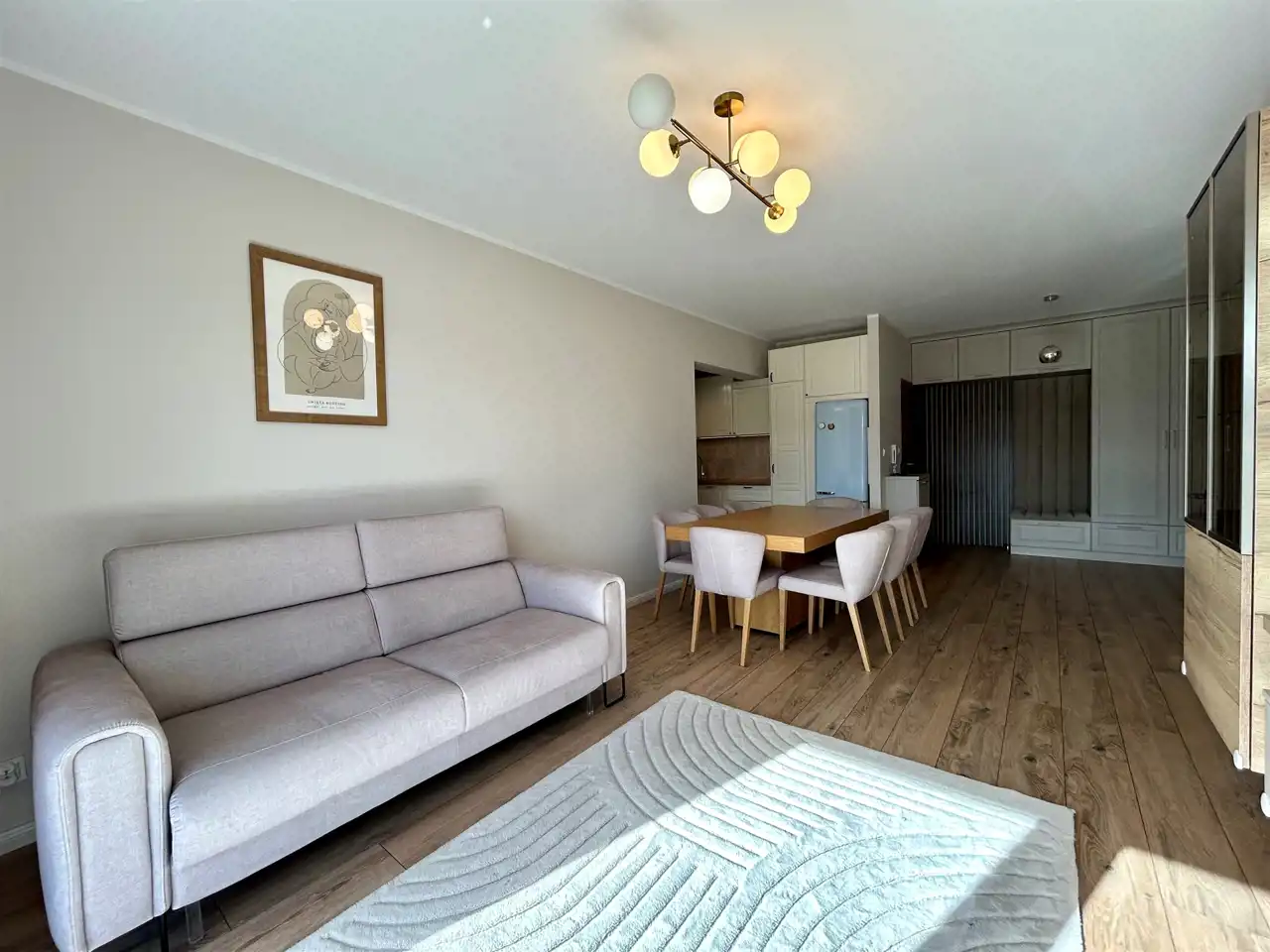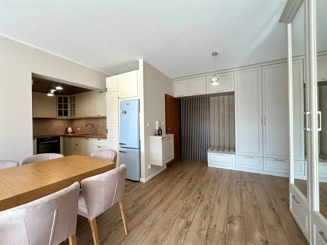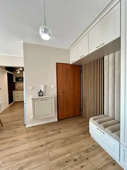 Mieszkanie zostało zaprojektowane z dbałością o każdy detal i wykończone w ponadczasowej, eleganckiej kolorystyce – dominują tu ciepłe beże oraz subtelne akcenty pistacji, które tworzą harmonijną i przytulną przestrzeń. Całość uzupełnia starannie dobrane, nowoczesne oświetlenie, podkreślające charakter wnętrza.