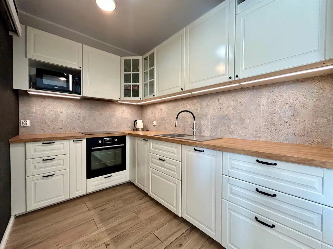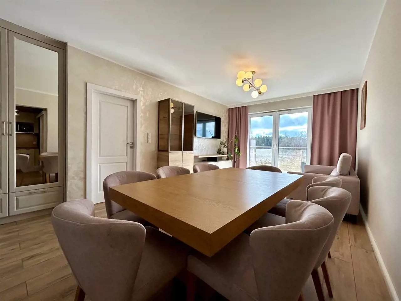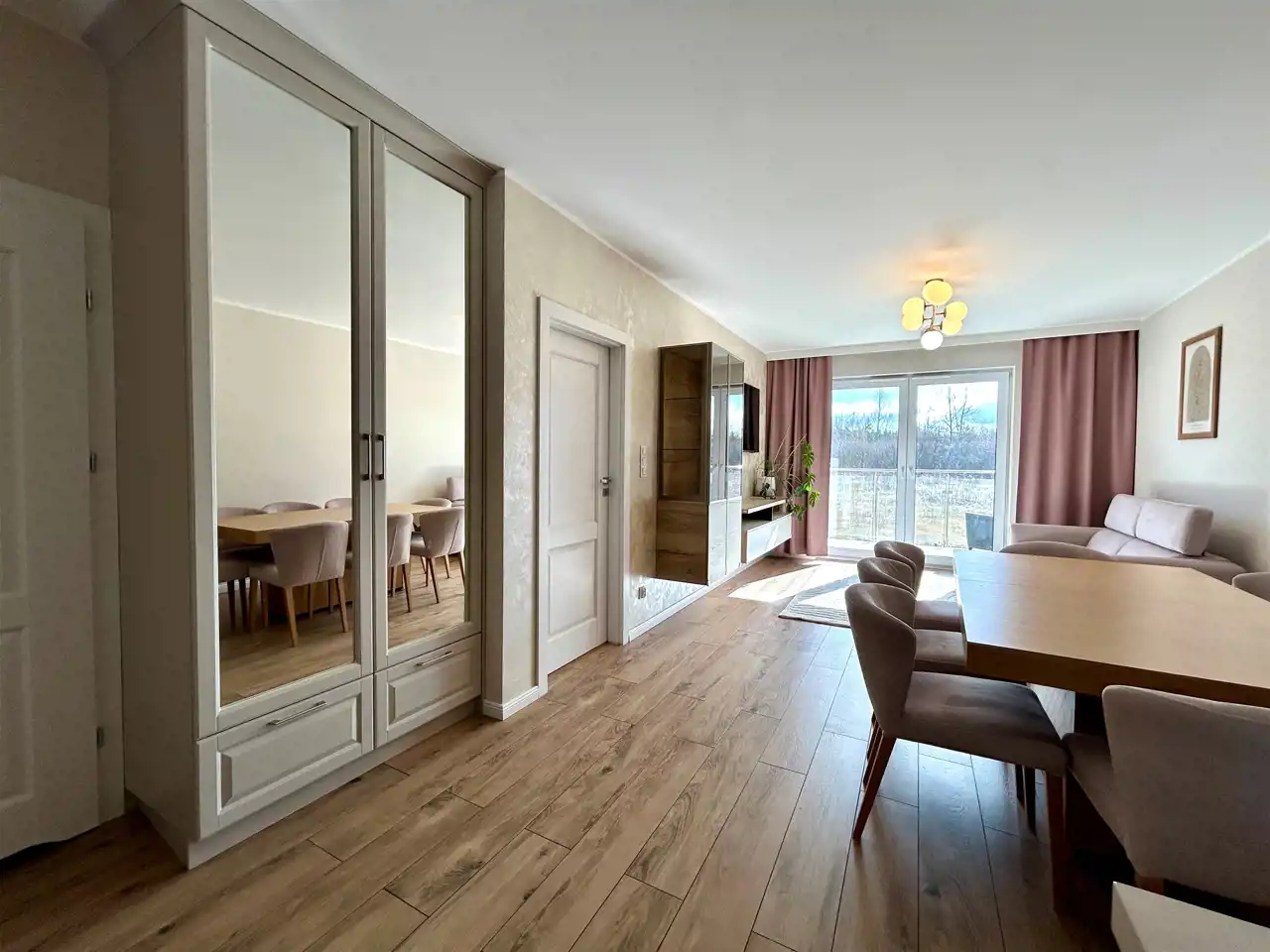 Mieszkanie zostało zaprojektowane z dbałością o każdy detal i wykończone w ponadczasowej, eleganckiej kolorystyce – dominują tu ciepłe beże oraz subtelne akcenty pistacji, które tworzą harmonijną i przytulną przestrzeń. Całość uzupełnia starannie dobrane, nowoczesne oświetlenie, podkreślające charakter wnętrza.
