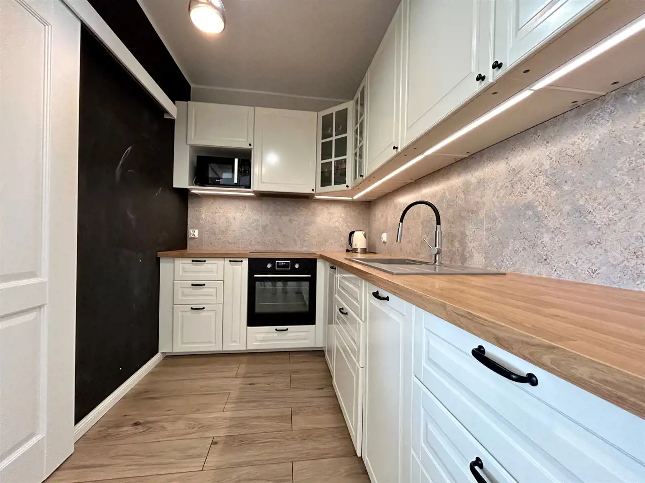 Kuchnia-niezwykle funkcjonalna. Oferuje dużo miejsca do przechowywania dzięki licznym szafkom i półkom, a także imponującą ilość blatu roboczego. Wyposażona jest w kompletny sprzęt AGD: piekarnik, płytę, zmywarkę, lodówkę oraz okap.