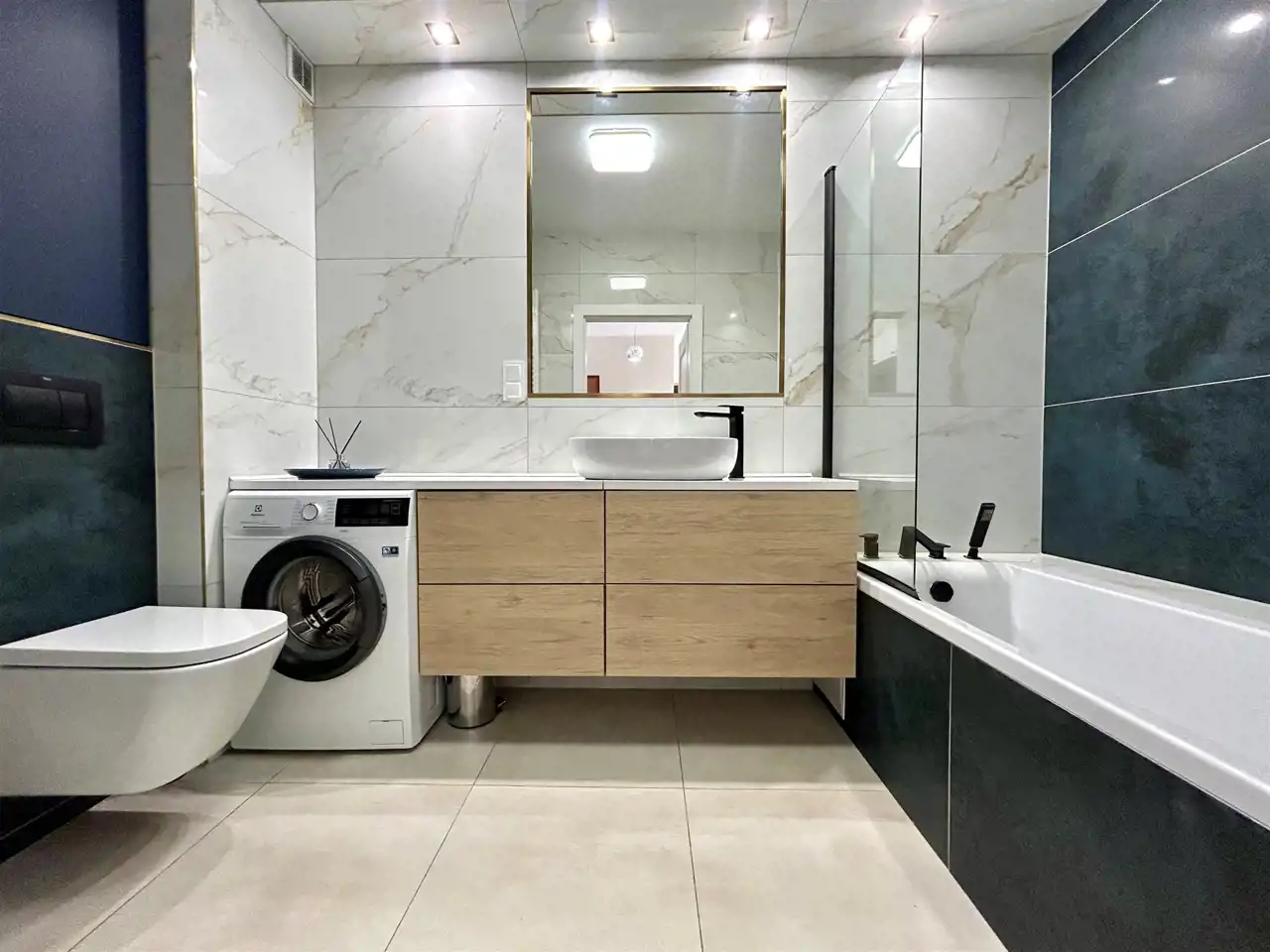 Łazienka jest przestronna i komfortowa – wyposażona w wannę z funkcją prysznica (dzięki zamontowanej szybie), pralkę oraz toaletę. Całość utrzymana w nowoczesnym, spójnym stylu.