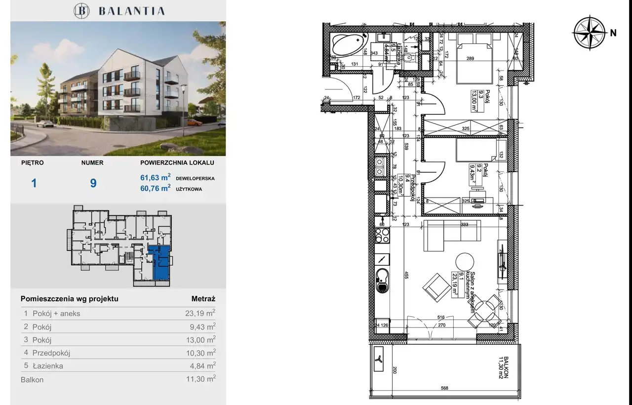 - Charakterystyka mieszkania 60.76 m2, 3 pokoje