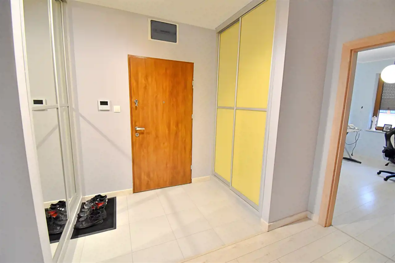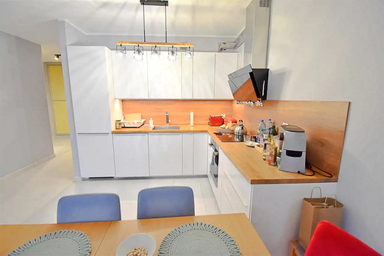 Mieszkanie wykończone zostało w wysokim standardzie. Na ścianach gładzie, na podłogach panele oraz kafle. Wysokiej jakości stolarka drzwiowa. Aneks kuchenny z meblami i AGD w pełni wyposażony, klimatyzacja, elektrycznie sterowane rolety zewnętrzne, wideodomofon. Całość utrzymana w bardzo dobrym stanie, nie wymaga żadnych nakładów finansowych.