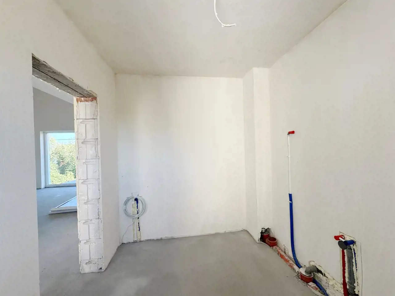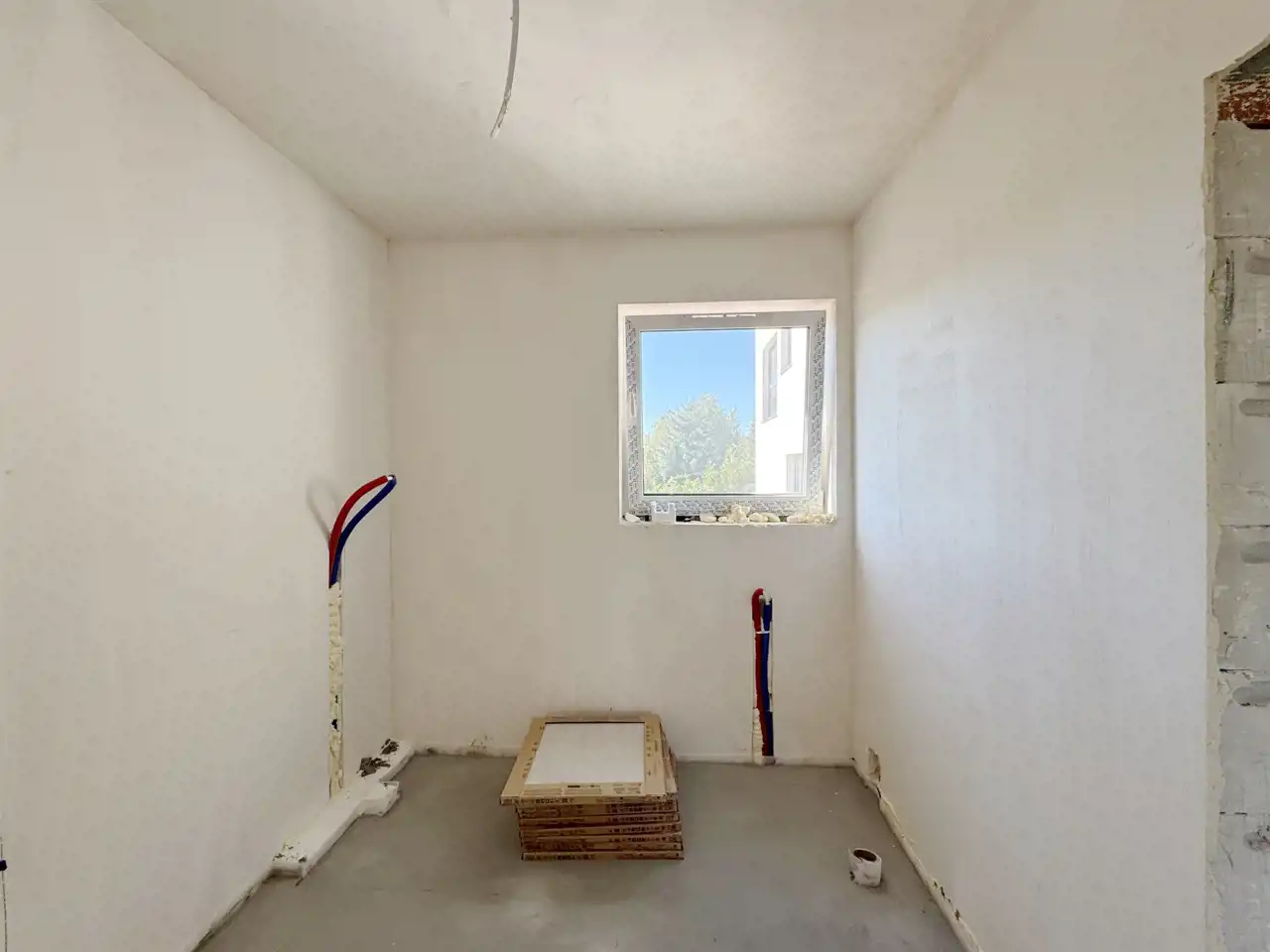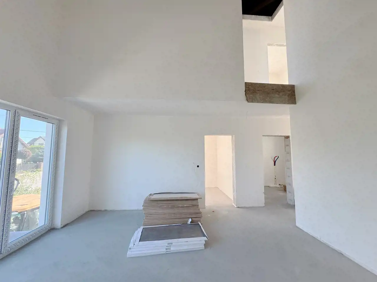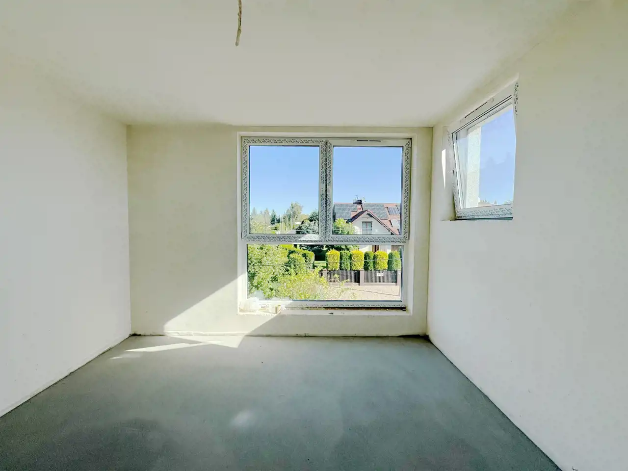 - Wykończenie wewnętrzne – tynki gipsowe przygotowane pod malowanie, wylewki betonowe podłóg ze styropianową izolacją.