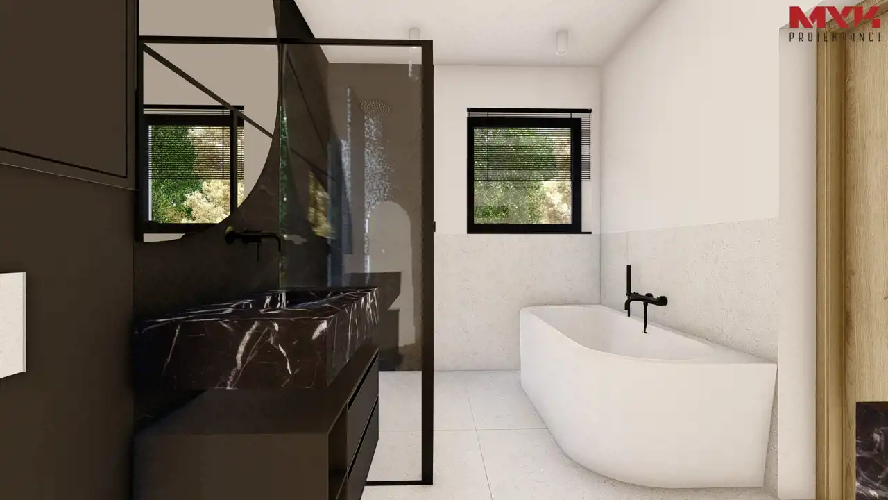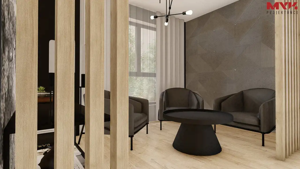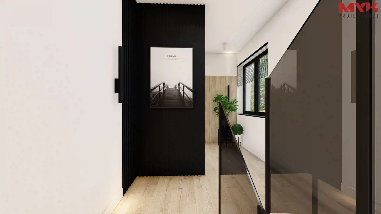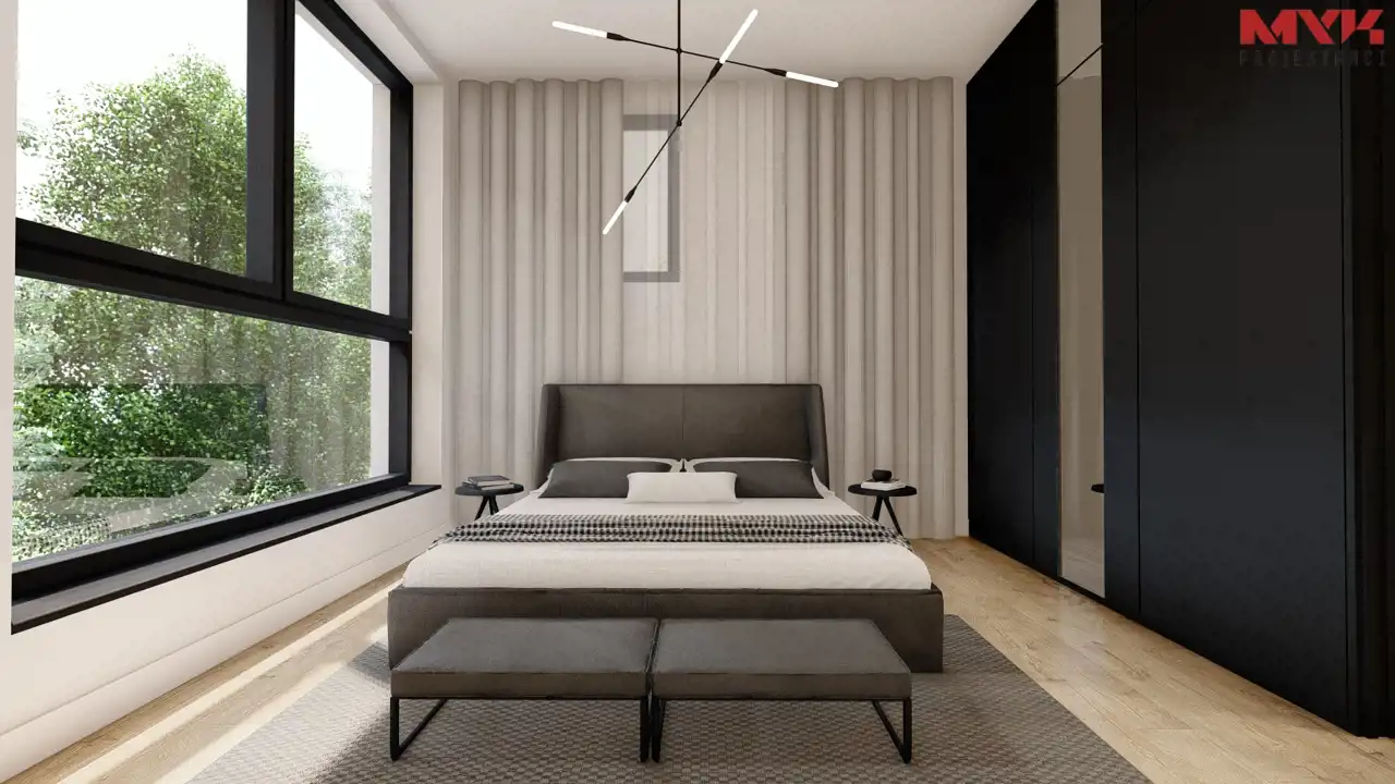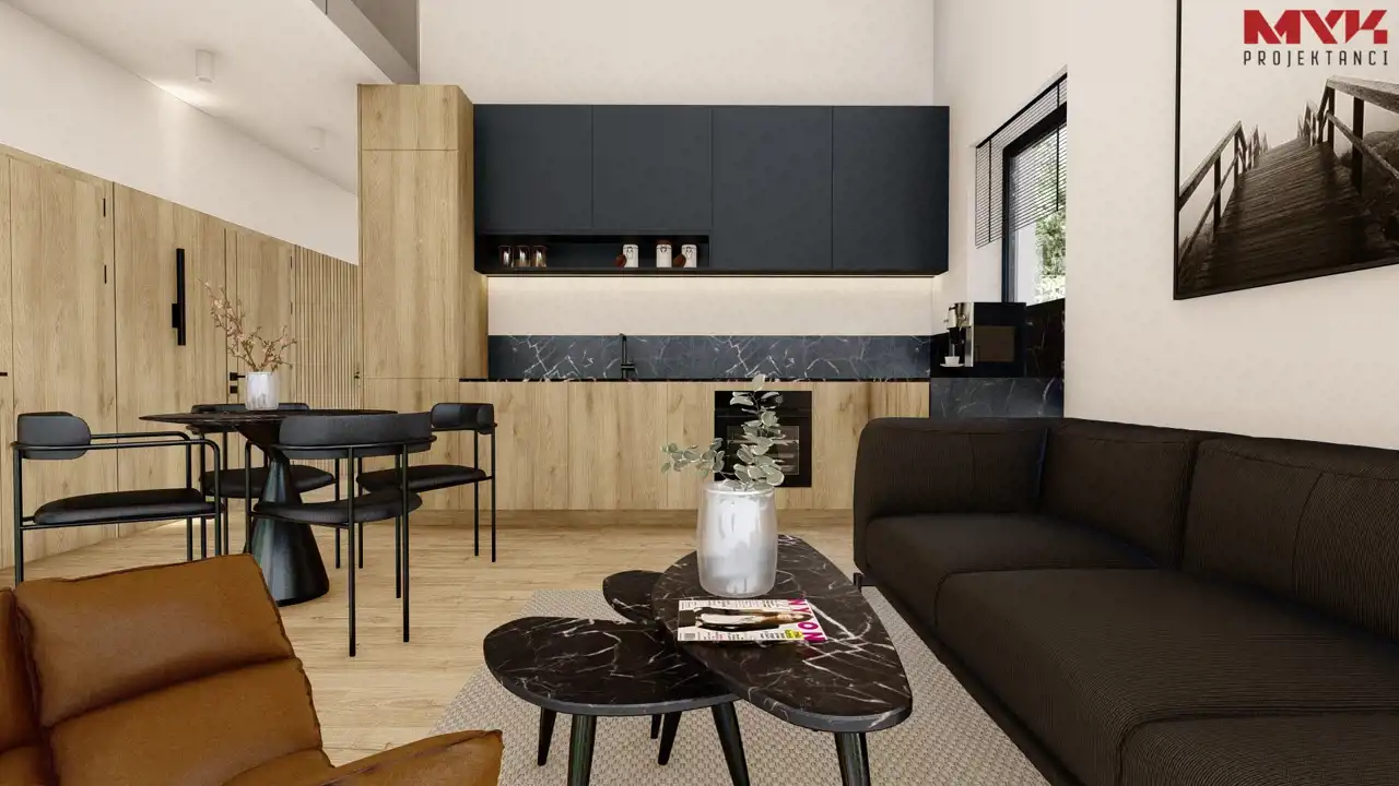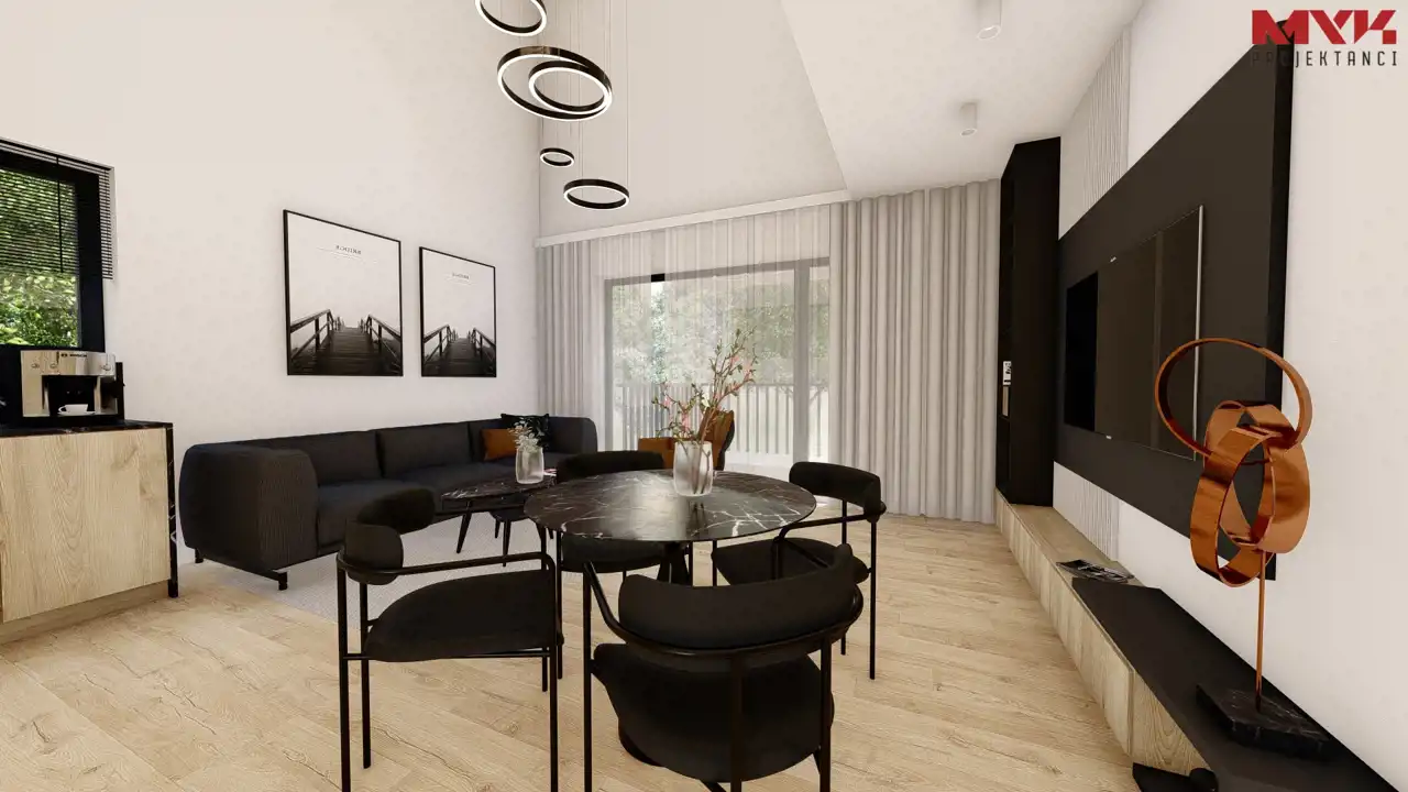 - Dach i elewacja – dach pokryty blachą na rąbek w kolorze antracytowym, elewacja w tynku cienkowarstwowym.