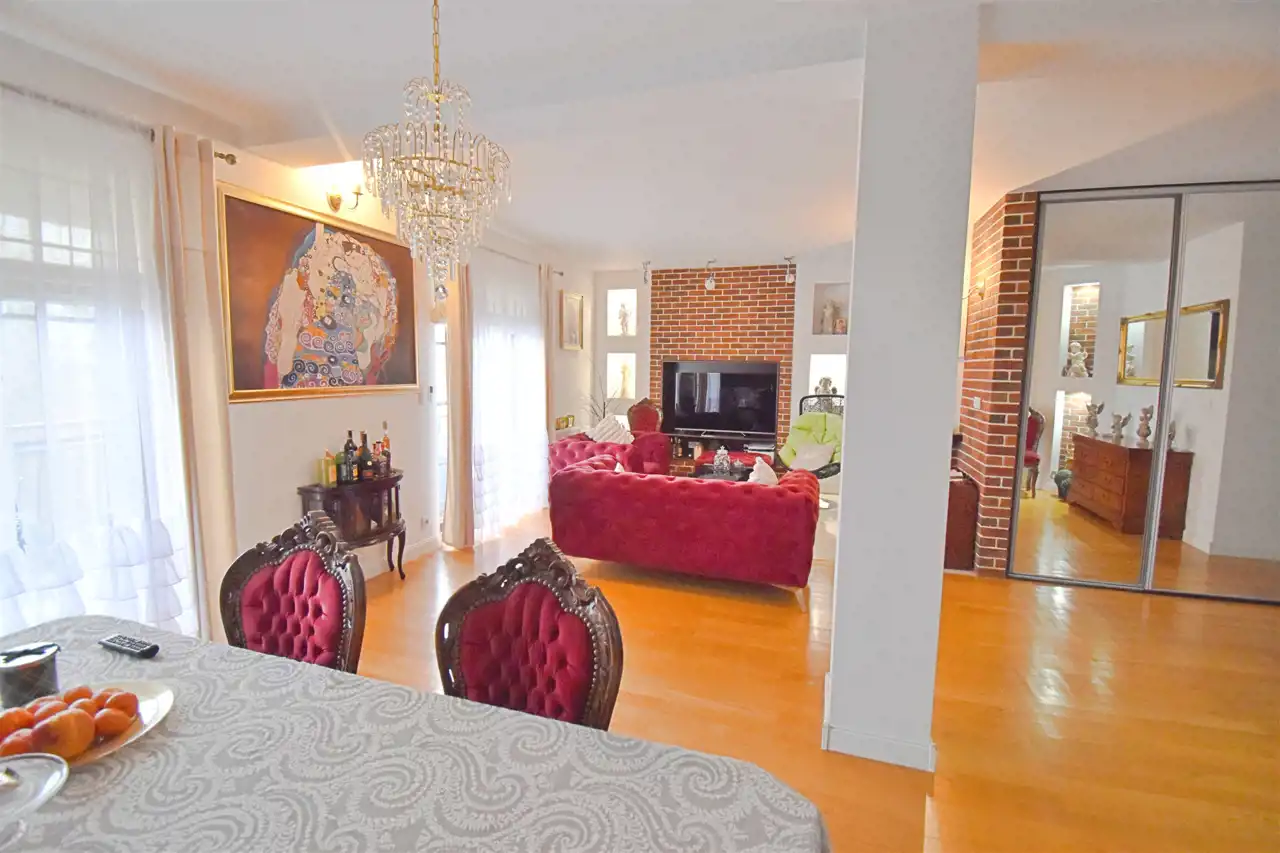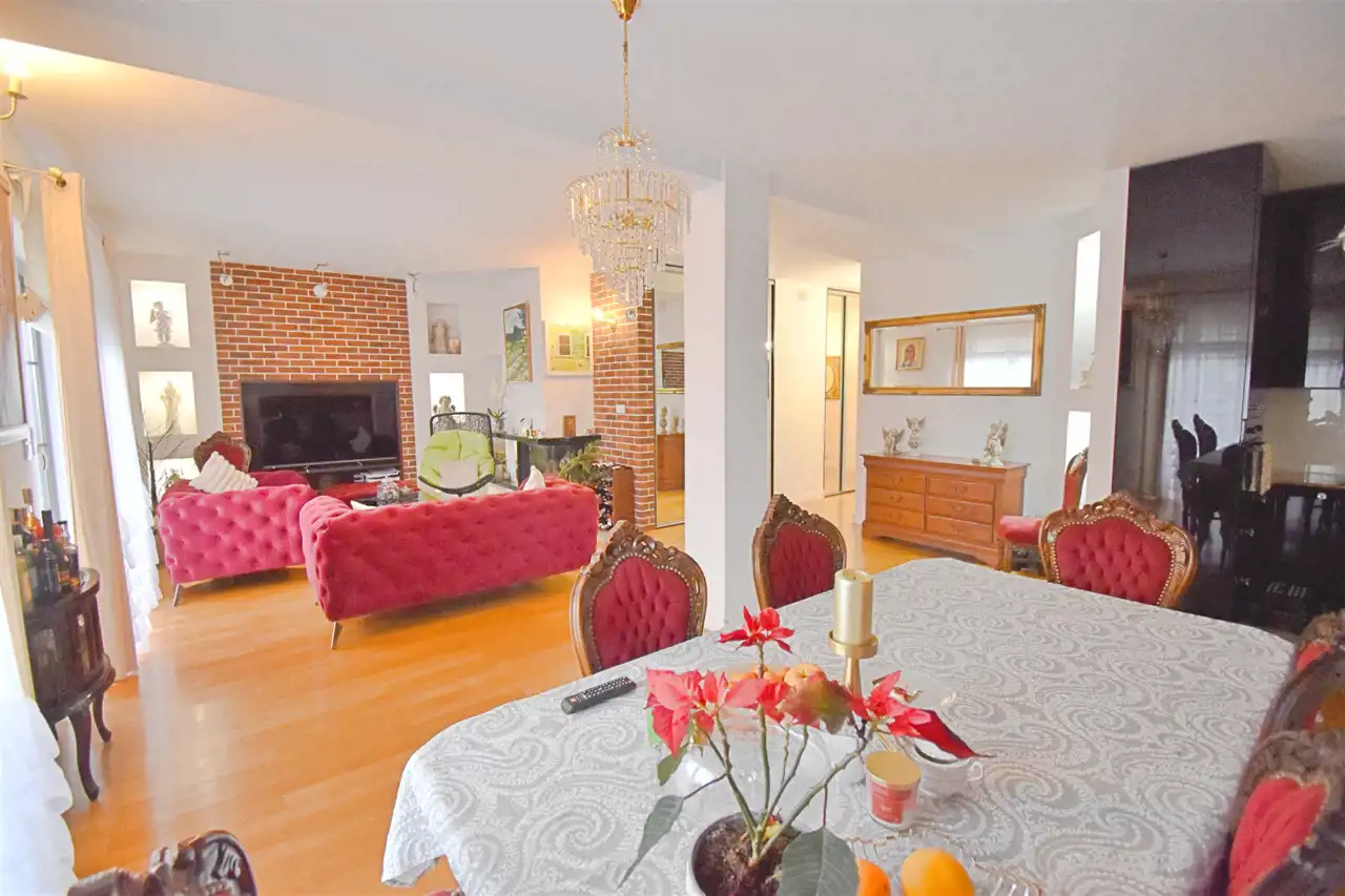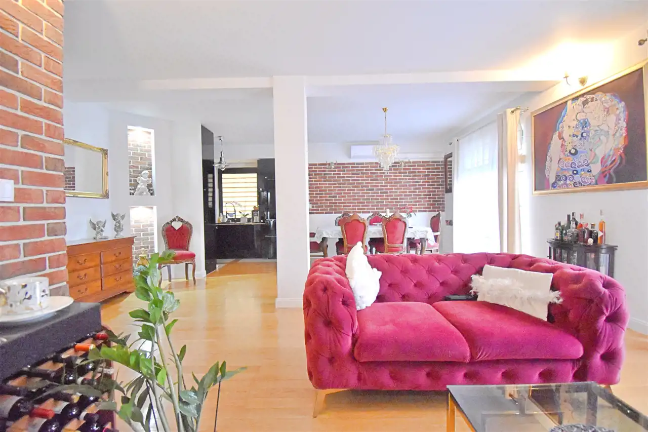 - Salonu z kominkiem połączonego z jadalnią i aneksem kuchennym (45 m²) z wyjściem na przestronny balkon, południowa ekspozycja okien