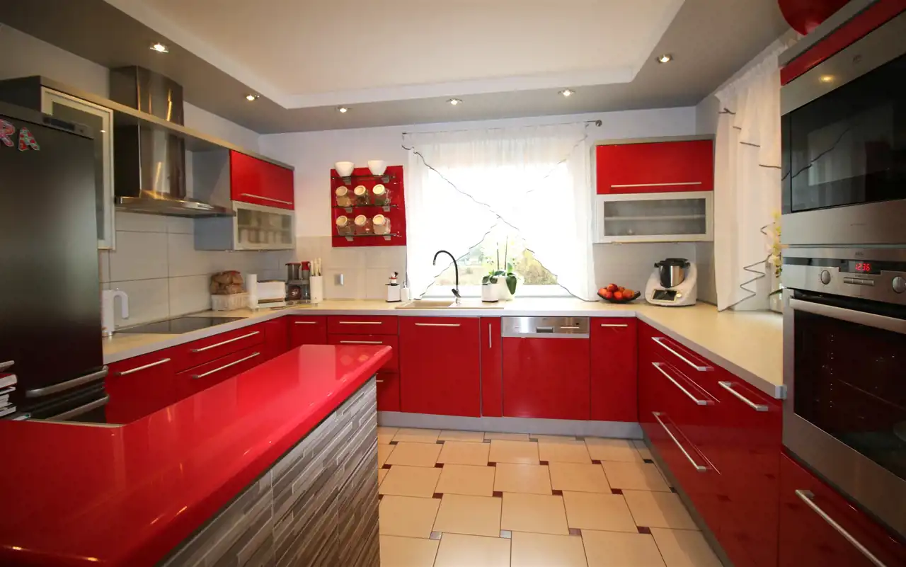 - częściowo otwartą na salon kuchnię o powierzchni 11 m², z dwoma dużymi oknami i imponującą ilością blatów roboczych. Kuchnia została wyposażona w sprzęt renomowanej marki AEG, w tym płytę grzewczą, piekarnik, mikrofalówkę, zmywarkę, okap, oraz lodówkę firmy BOSCH. Całe wyposażenie utrzymane jest w eleganckim kolorze INOX;