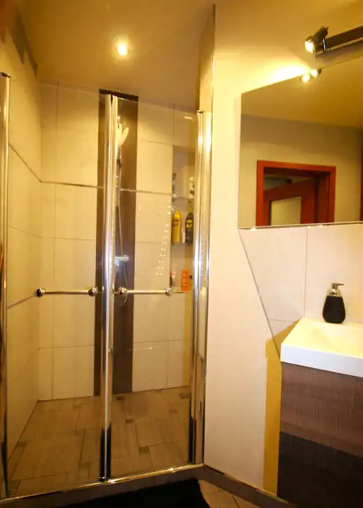 - drugą łazienkę (5m2) z ogrzewaniem podłogowym, wygodną, dużą kabiną prysznicową i zabudową na wymiar, kryjącą w sobie m.in. pralkę;
