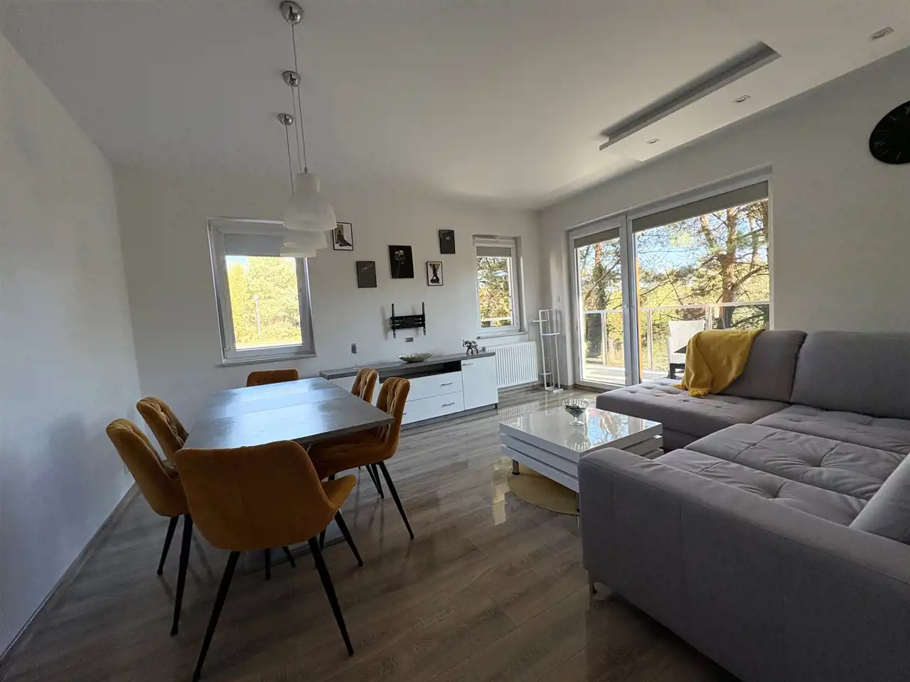 - przestronny salon z wyjściem na 13-metrowy taras, który zaprasza do porannej kawy w promieniach słońca pośród drzew,