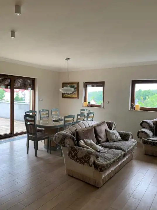 Ogromnym atutem nieruchomości jest bardzo duży taras o powierzchni aż 80 m², zapewniający dodatkową przestrzeń do wypoczynku, spotkań oraz aranżacji zielonej strefy relaksu.