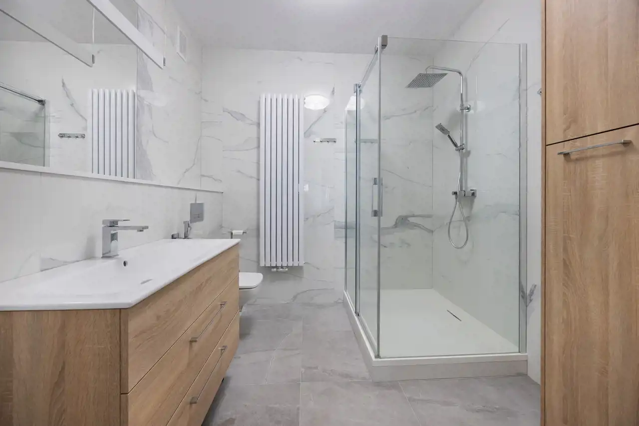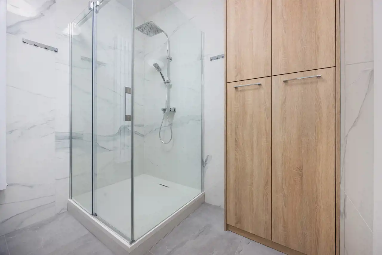 ◉ Łazienka z prysznicem jest komfortowa, duża, zawiera szafkę umywalkowa oraz szafę pod zabudowę. Prysznic jest bardzo duży. Wykończona jest w najnowszych trendach w jasnym kolorze.