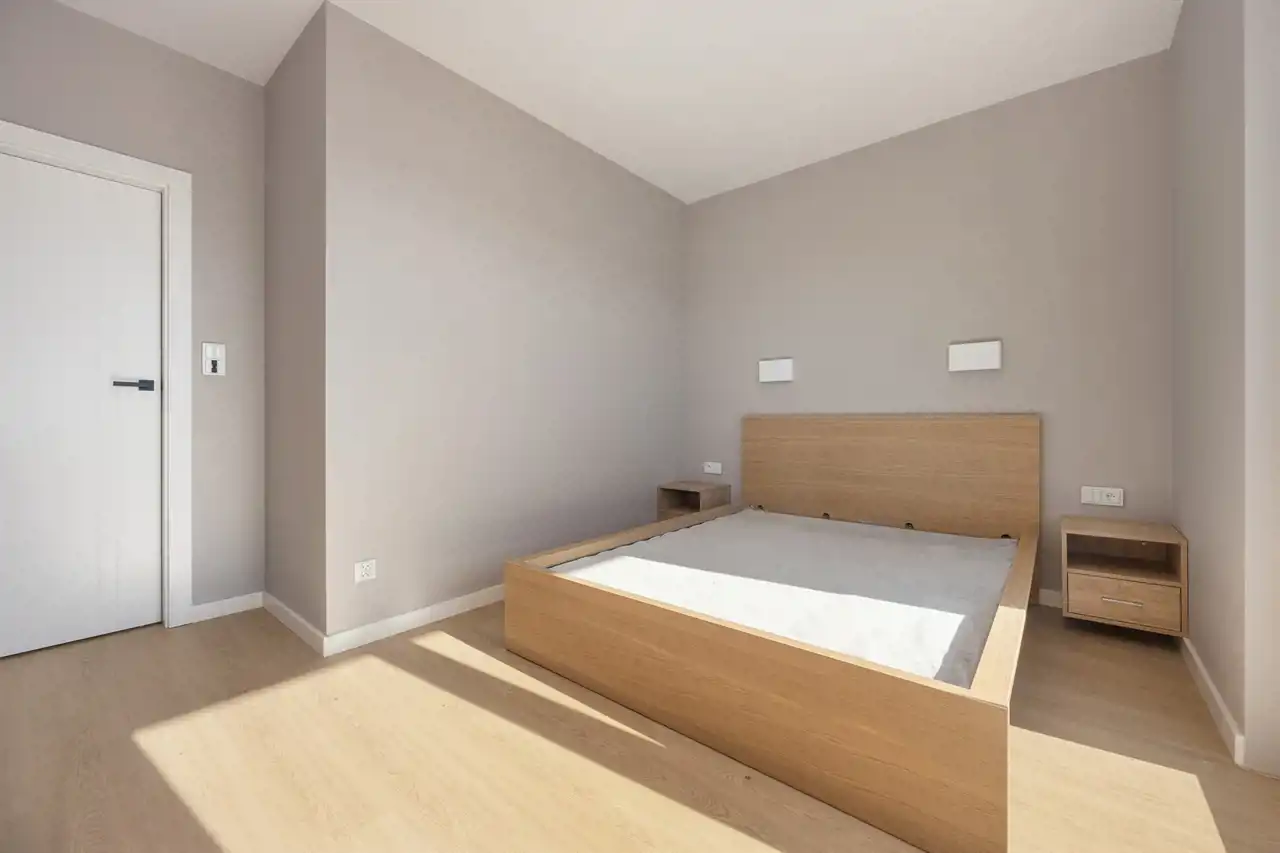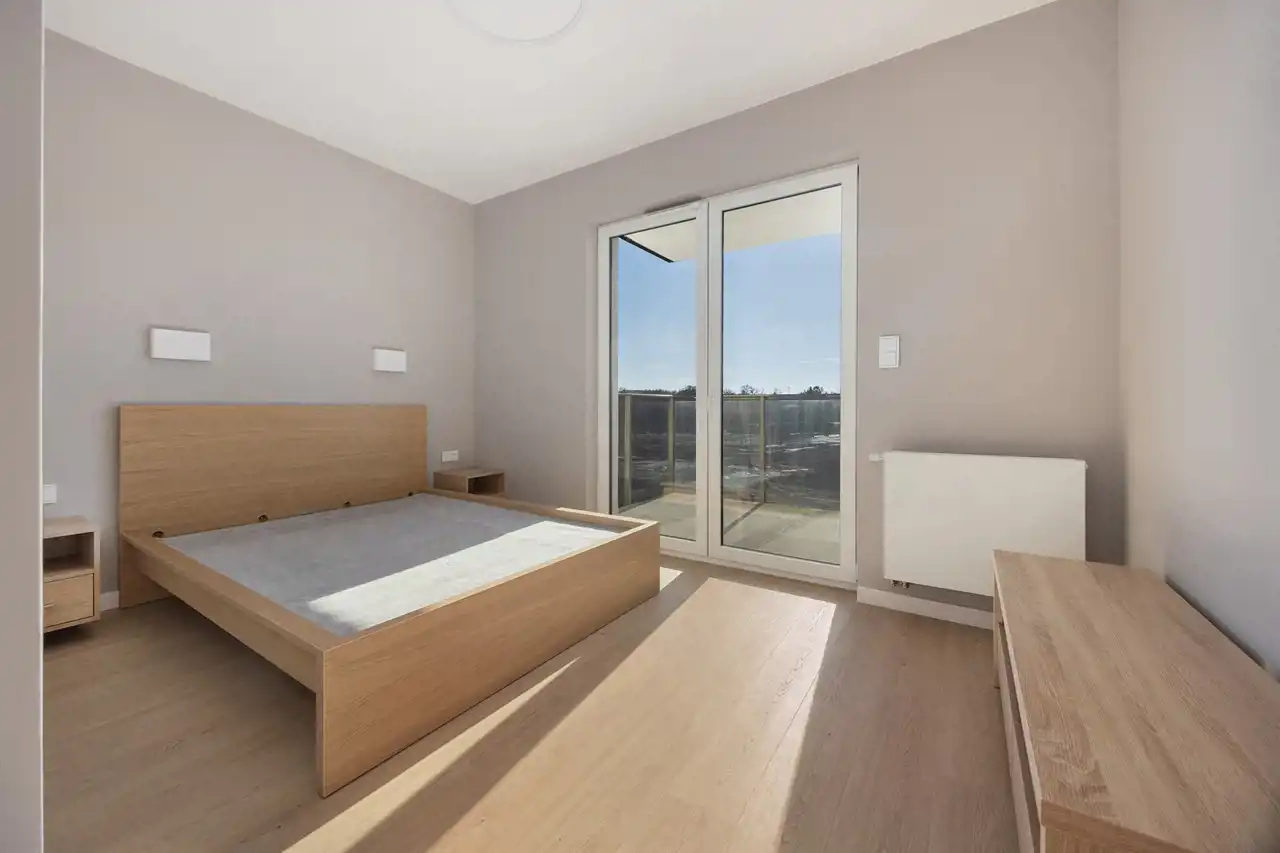 ◉ W sypialni znajduje się duże w kolorze jasnego dębu łóżko z szafkami nocnymi oraz komodą. Ogromnym atutem jest duże otwierane okno do ziemi, które wpuszcza dużo światła oraz umożliwia wyjście na balkon.