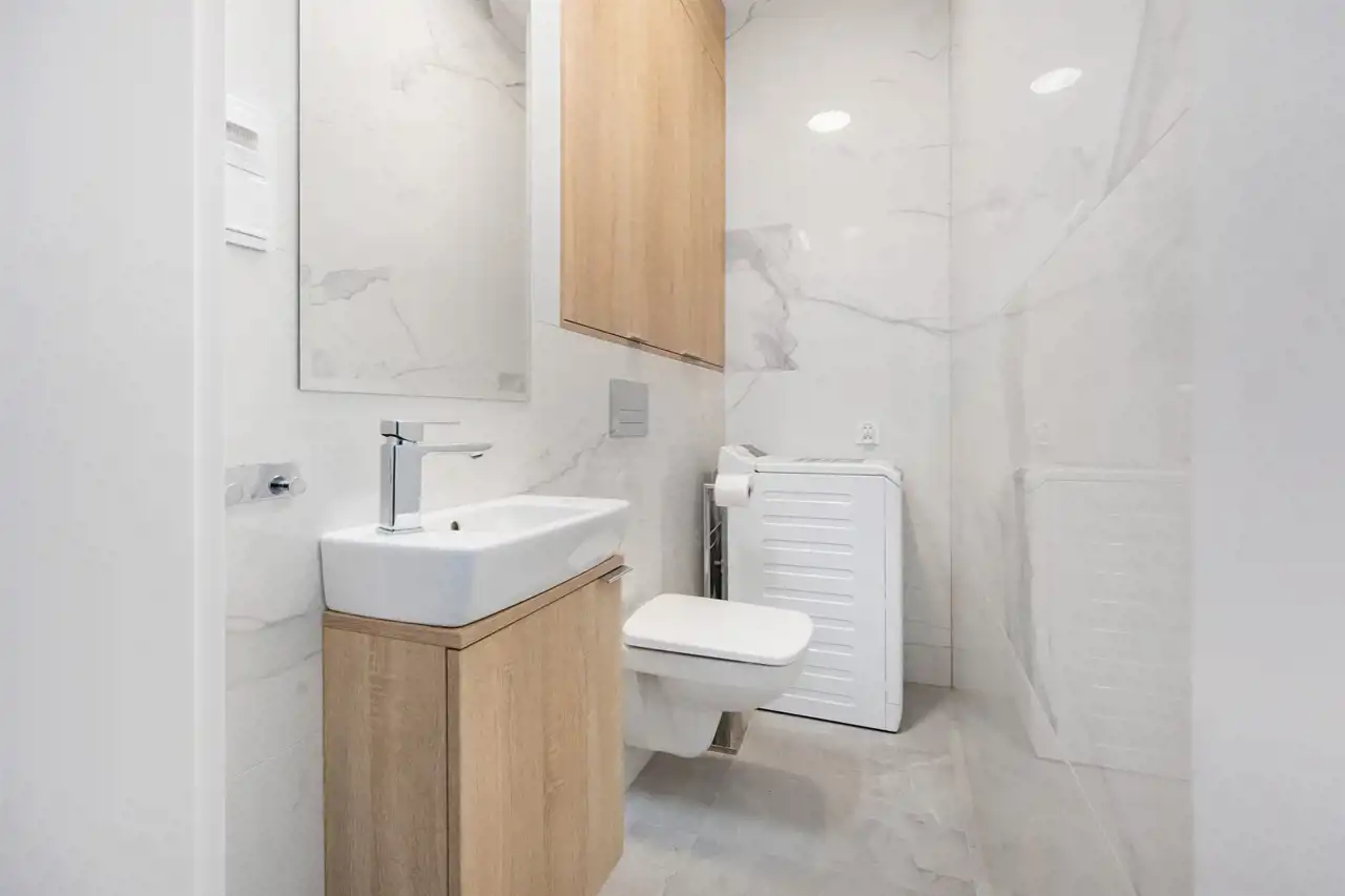 ◉ WC jest stylistycznie bardzo zbliżone do głównej łazienki, mieści się w niej pralka, ubikacja i umywalka.