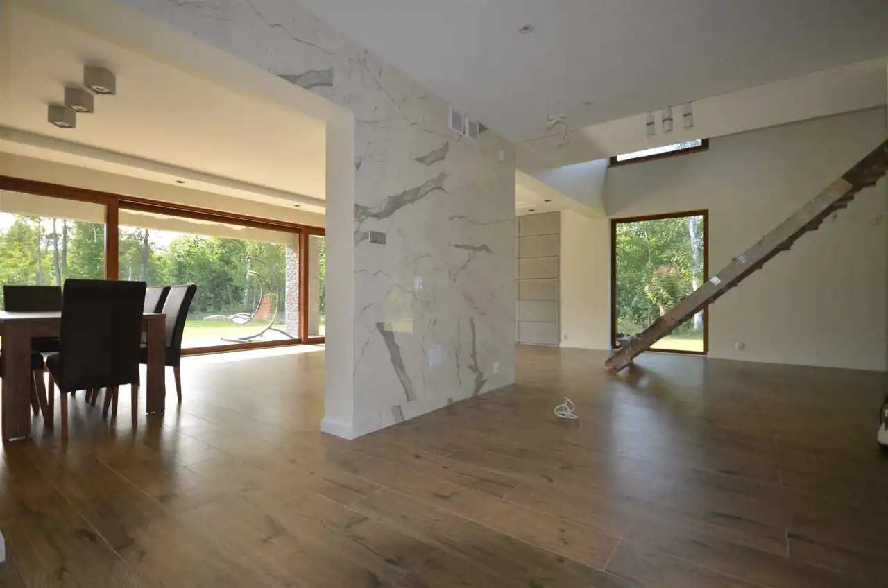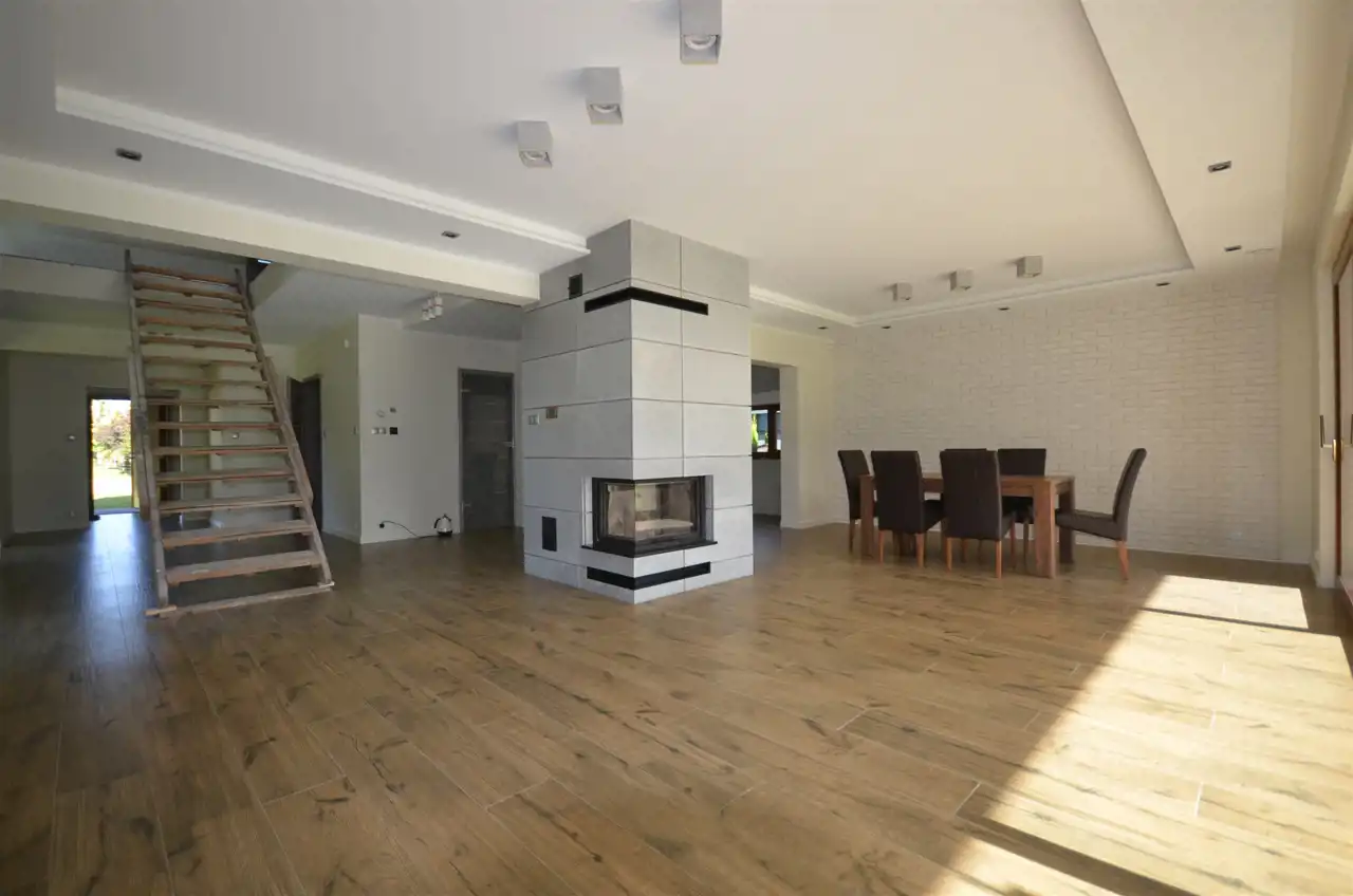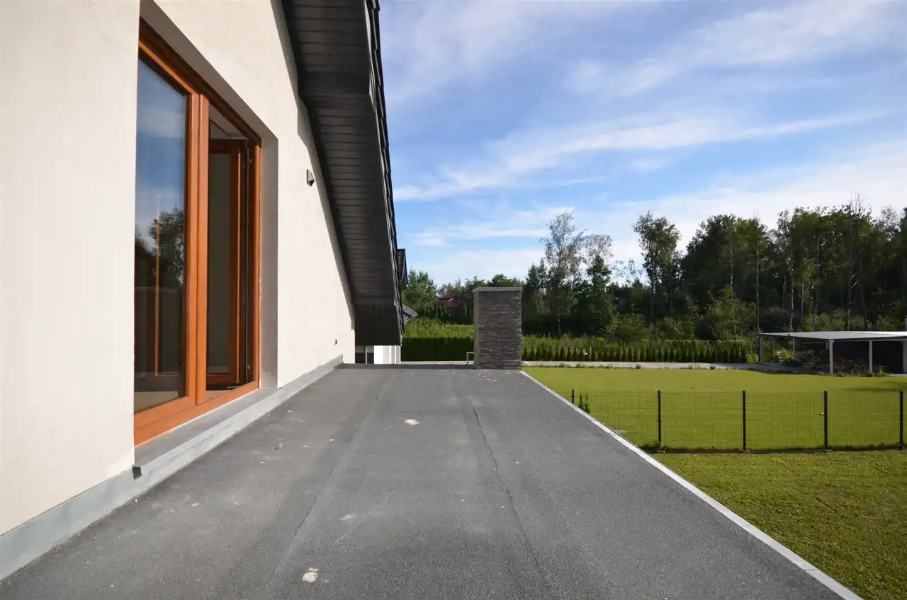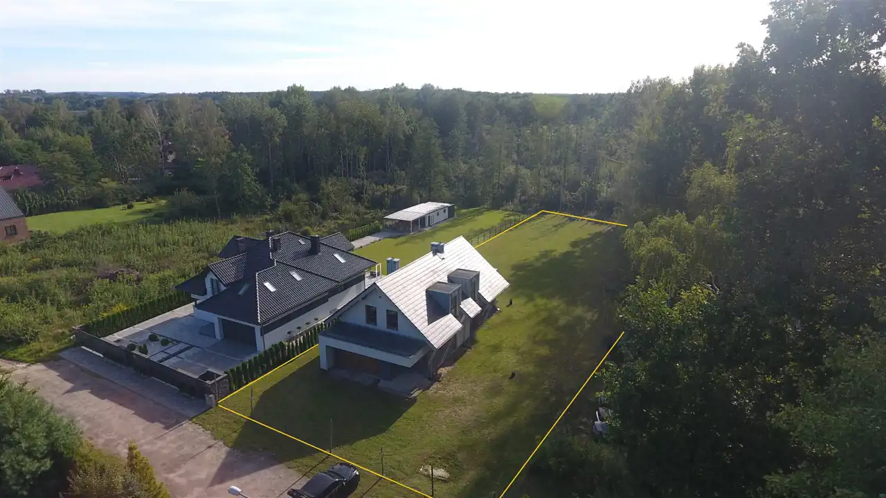 Dom o powierzchni całkowitej ok. 230m2/ użytkowej ok.172m2 posadowiony na działce o pow. 1495m2 otoczonej w tylnej części ścianą lasu.