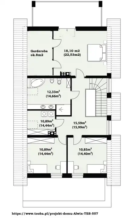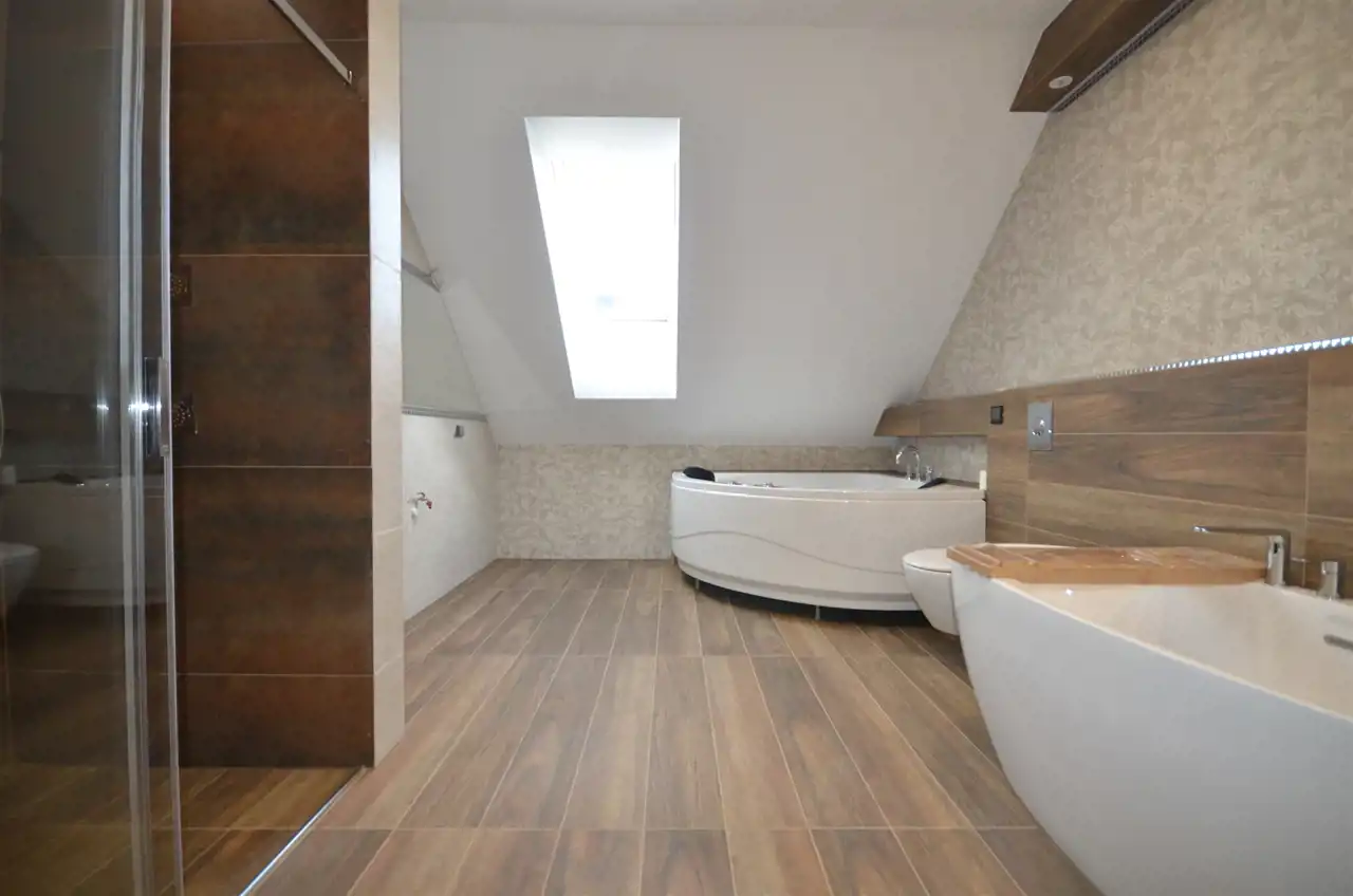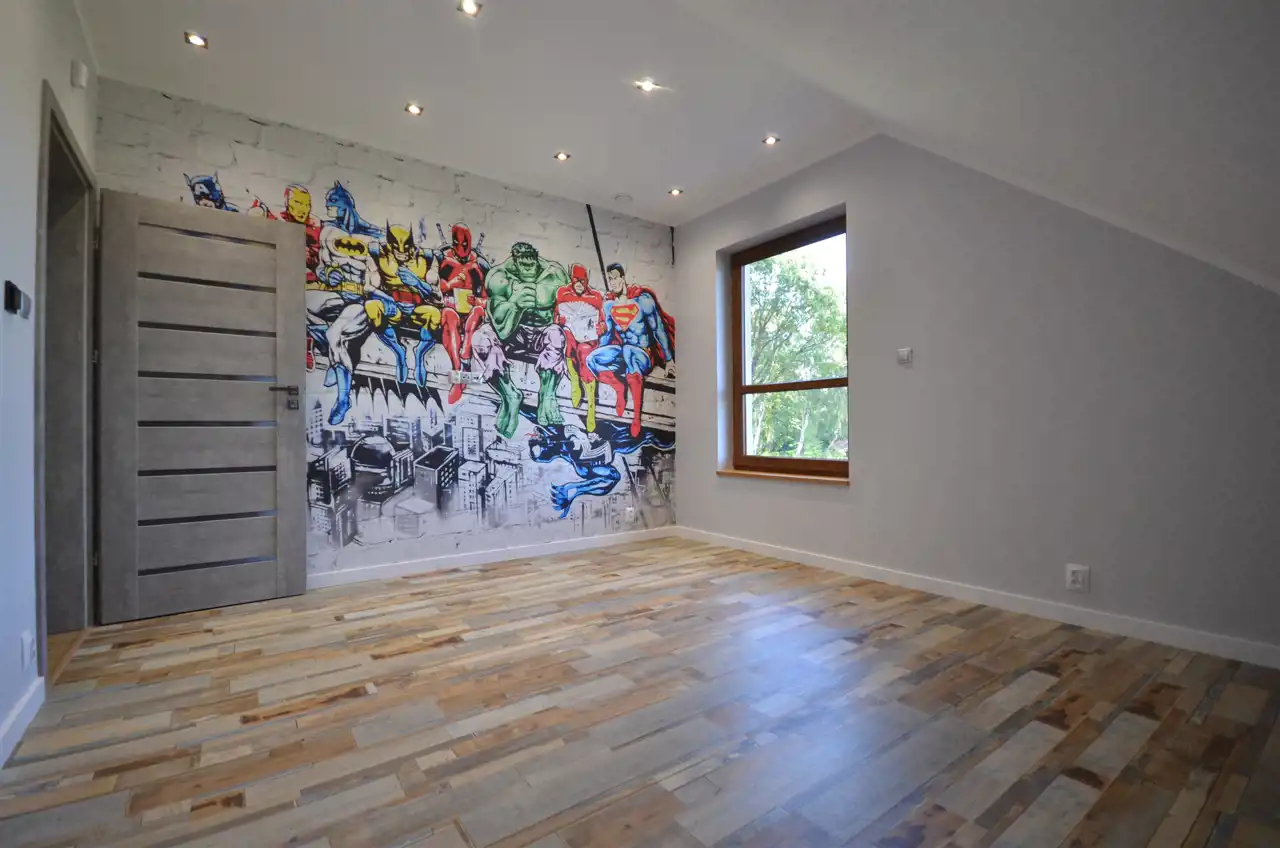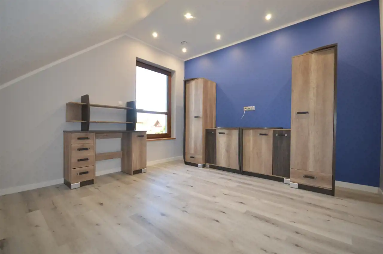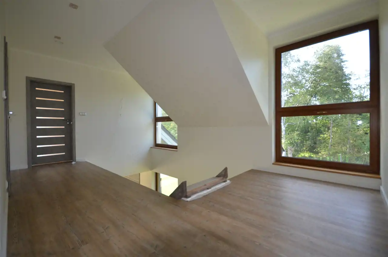Piętro domu: schody do własnej aranżacji, przestronny hol , łazienka z jacuzzi, kabina prysznicowa i dodatkowo wanna, pomieszczenie na pralnie , sypialnia z dwoma garderobami i wyjściem na duży taras z panoramą działki i lasu oraz dwa pokoje dziecięce.