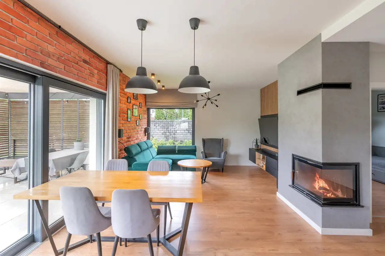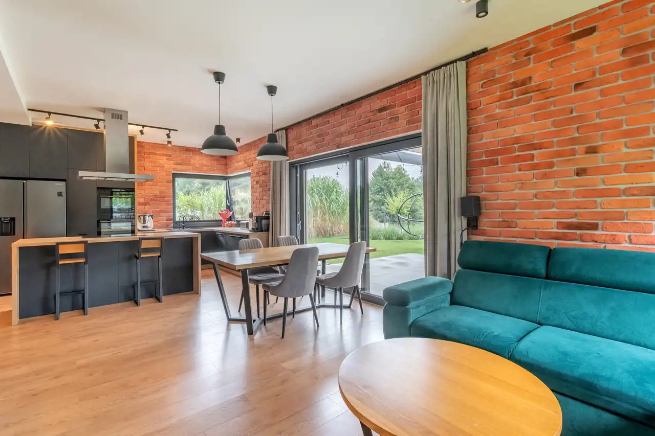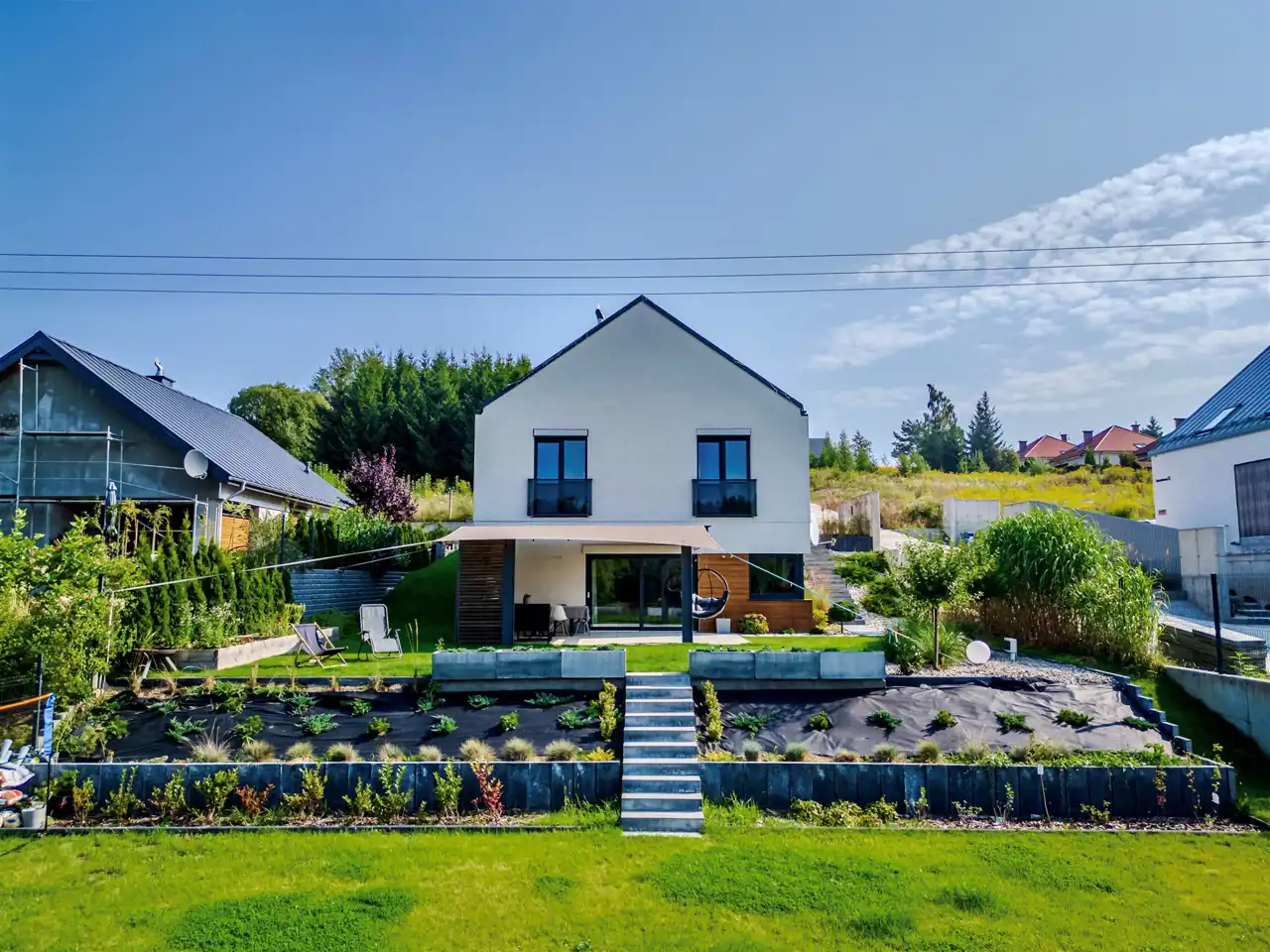 Całość wykończono z dbałością o detale i zastosowano materiały wysokiej klasy. Dom wyposażono w ogrzewanie podłogowe na całej powierzchni, nowoczesny piec gazowy oraz kominek z rozprowadzeniem ciepła. Komfort życia podnoszą także okna trzyszybowe, dach z blachy na rąbek z grubą izolacją, centralny odkurzacz z szufelką, system filtrów wody i podłączenie do miejskiej kanalizacji tłoczonej. To gwarancja bezobsługowego użytkowania, wygody i niskich kosztów utrzymania.