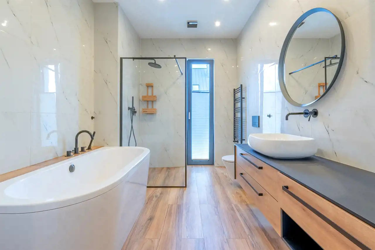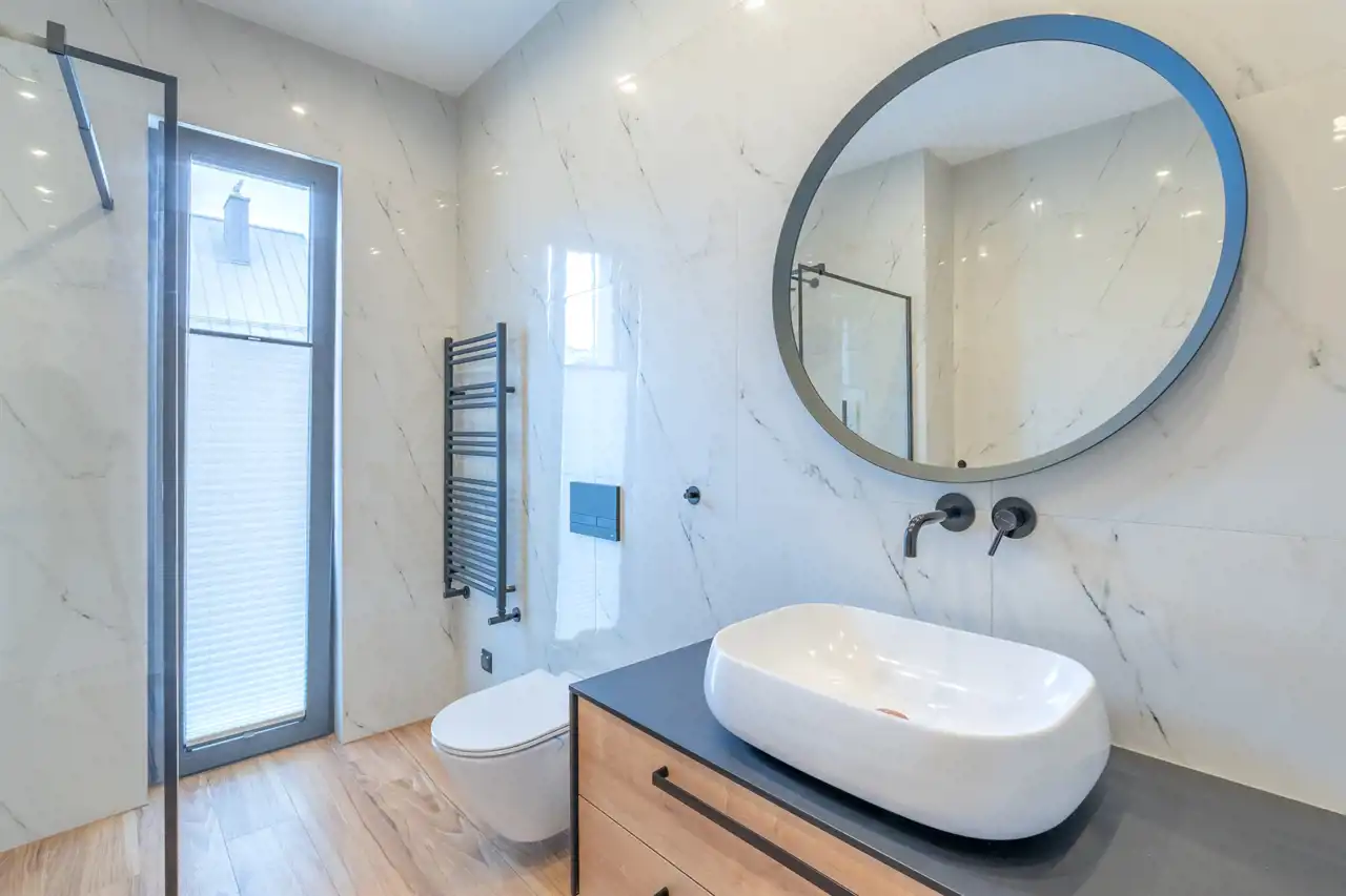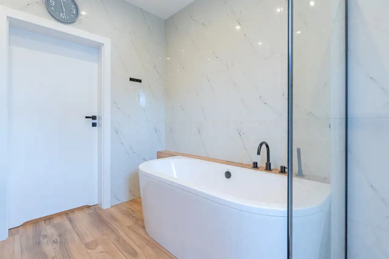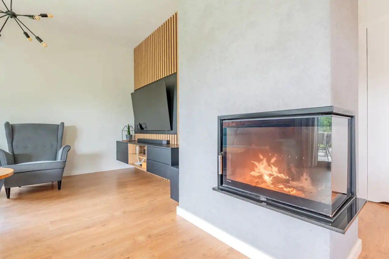 Całość wykończono z dbałością o detale i zastosowano materiały wysokiej klasy. Dom wyposażono w ogrzewanie podłogowe na całej powierzchni, nowoczesny piec gazowy oraz kominek z rozprowadzeniem ciepła. Komfort życia podnoszą także okna trzyszybowe, dach z blachy na rąbek z grubą izolacją, centralny odkurzacz z szufelką, system filtrów wody i podłączenie do miejskiej kanalizacji tłoczonej. To gwarancja bezobsługowego użytkowania, wygody i niskich kosztów utrzymania.