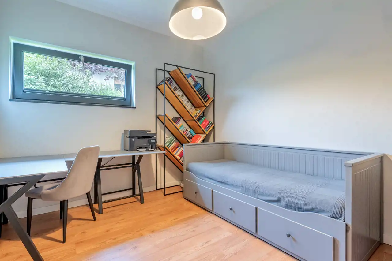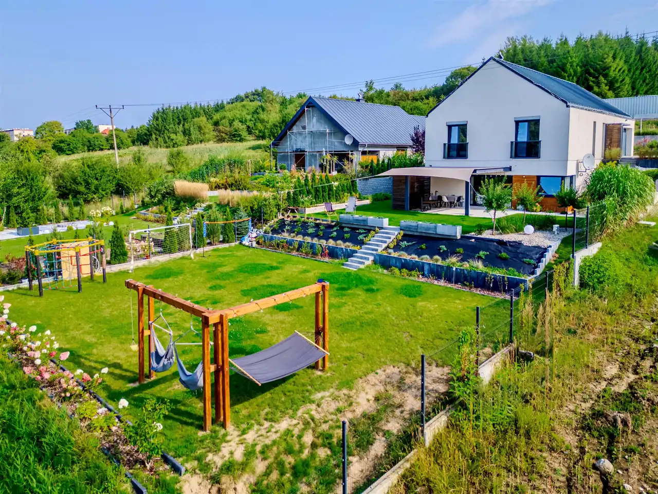 W bryle budynku znajduje się również ogrzewany garaż dwustanowiskowy, pomieszczenie gospodarcze i kotłownia (łącznie 52 m²). Ponad 80 m² dodatkowej powierzchni nad garażem daje ogromne możliwości aranżacyjne – można stworzyć tam pokój rekreacyjny, siłownię, pracownię, salę kinową lub kolejne sypialnie.