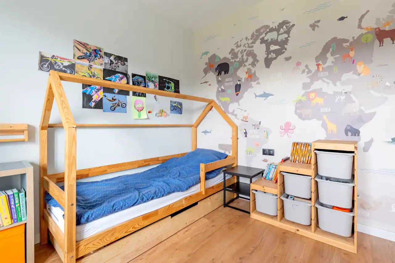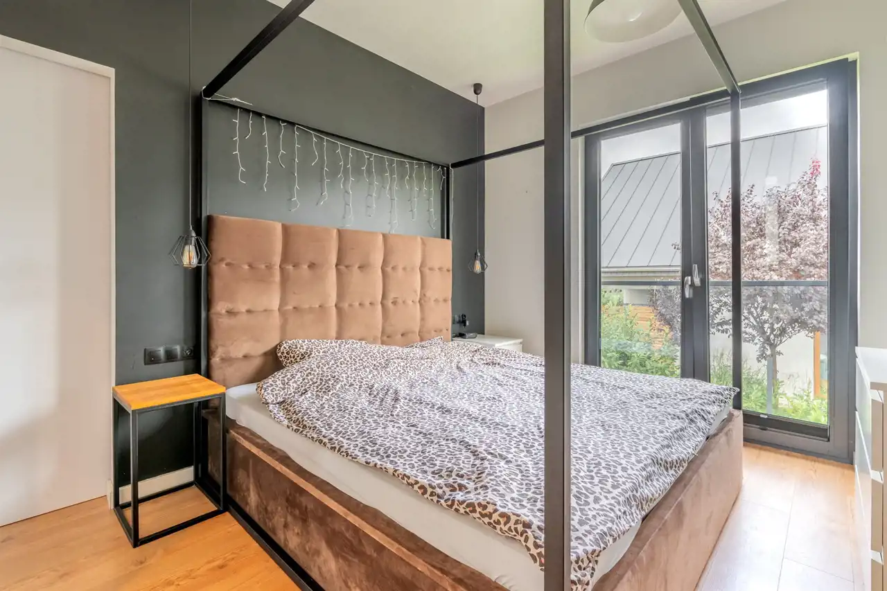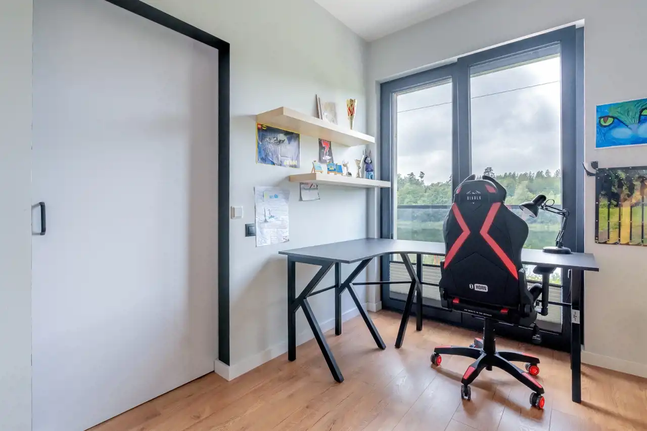 Piętro (ok. 74 m²) mieści sypialnię główną z prywatną łazienką i garderobą, a także dwie dodatkowe sypialnie – każda z własną garderobą – oraz komfortową łazienkę dostępną z korytarza. To prywatna część domu, która zapewnia domownikom intymność i przestrzeń.