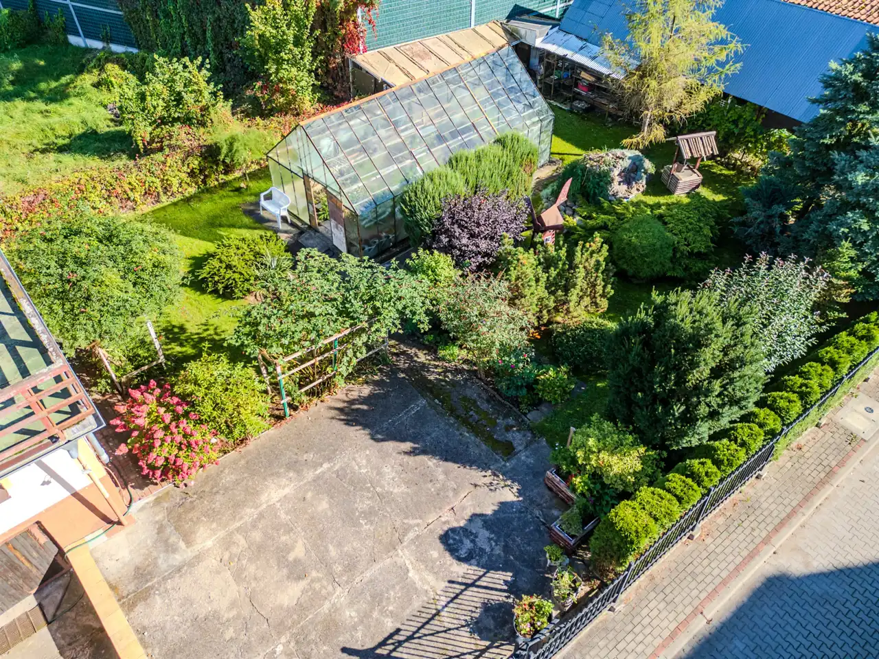 Dzięki przemyślanej konstrukcji i przestronnej działce można stworzyć tu miejsce z prawdziwym charakterem – ciepły rodzinny dom z ogrodem, przydomowe biuro lub przestrzeń łączącą oba te światy.