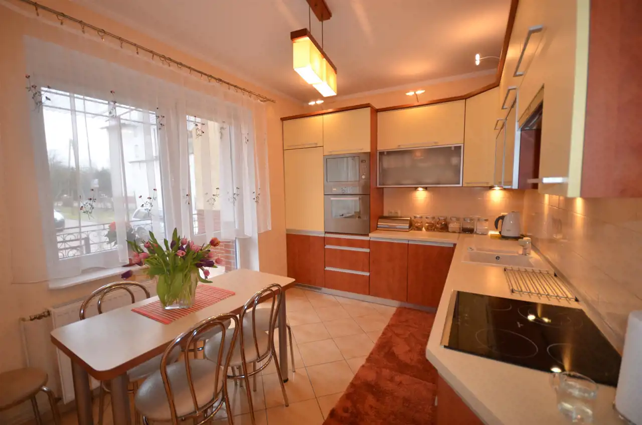 - kuchnia z oknem w zabudowie z wyjściem na taras i ogródek,