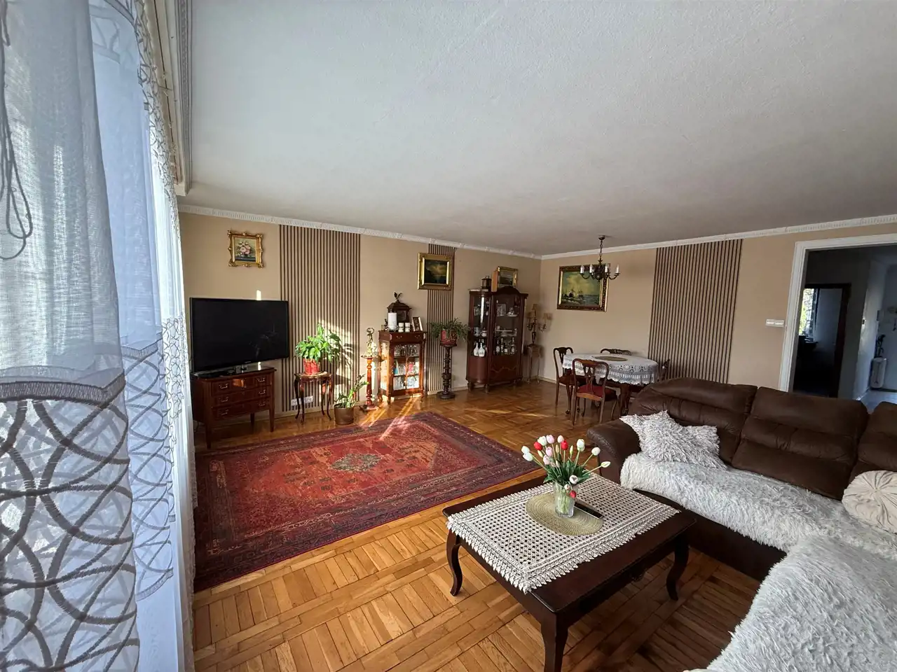 * piękny, przestronny i słoneczny salon, wyposażony w kanapę stół z krzesłami oraz meble