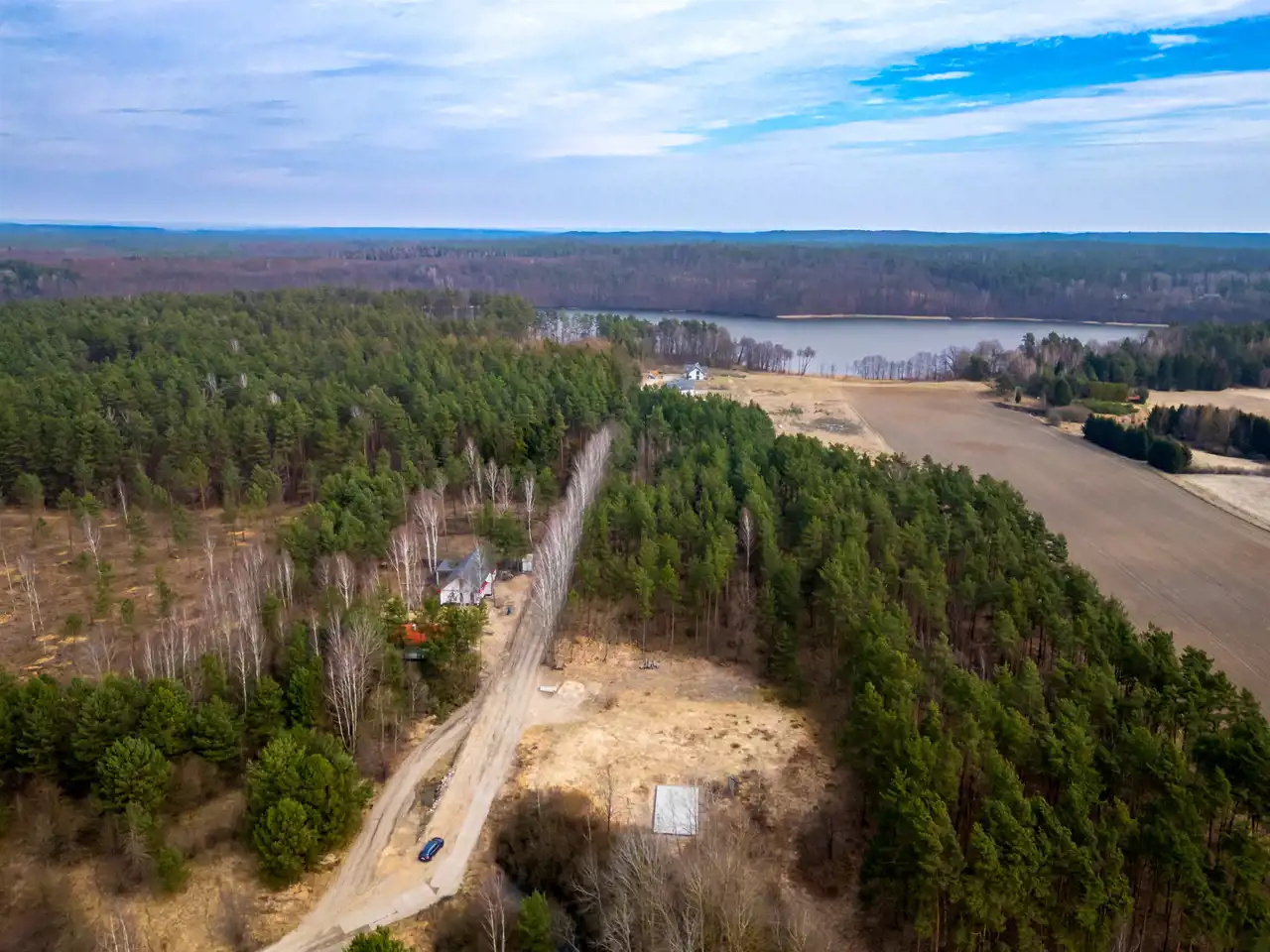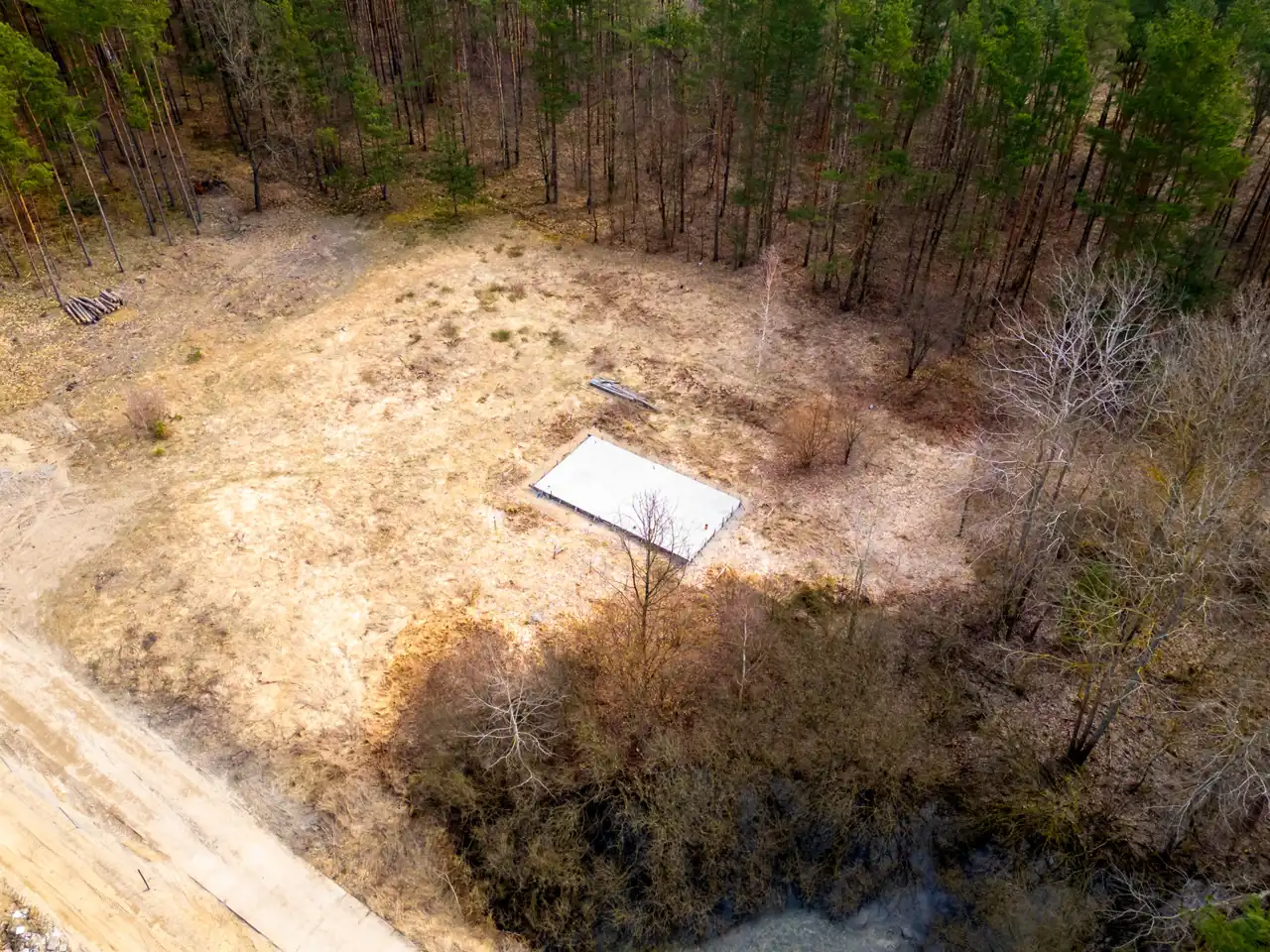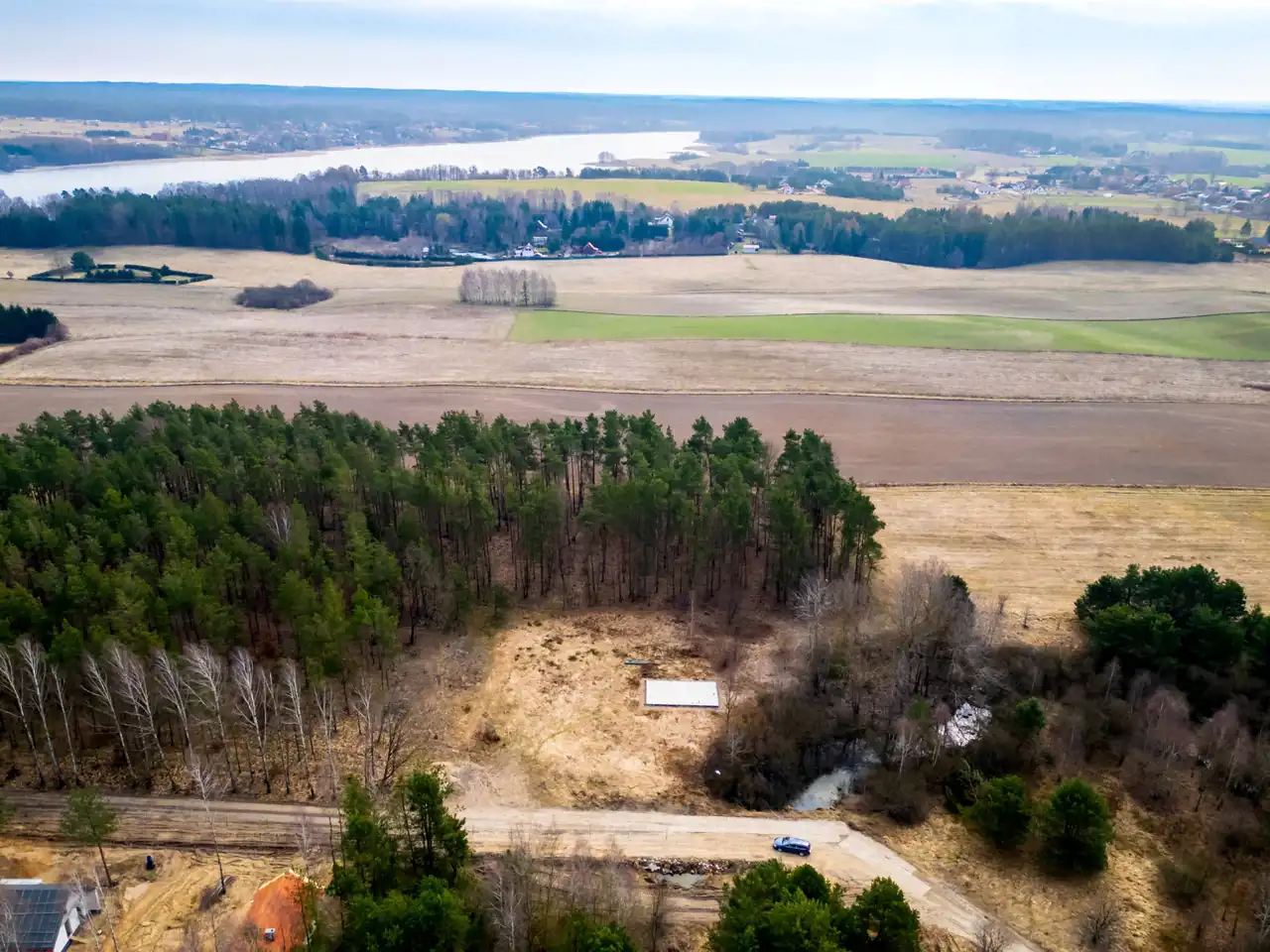Sama działka również ma ogromny atut: teren jest równy, co daje wygodę przy dalszej realizacji inwestycji i zagospodarowaniu przestrzeni. Dodatkowo nieruchomość otoczona jest lasami, dzięki czemu to miejsce daje coś, czego dziś szuka coraz więcej osób — ciszę, prywatność i prawdziwy oddech od codziennego tempa.