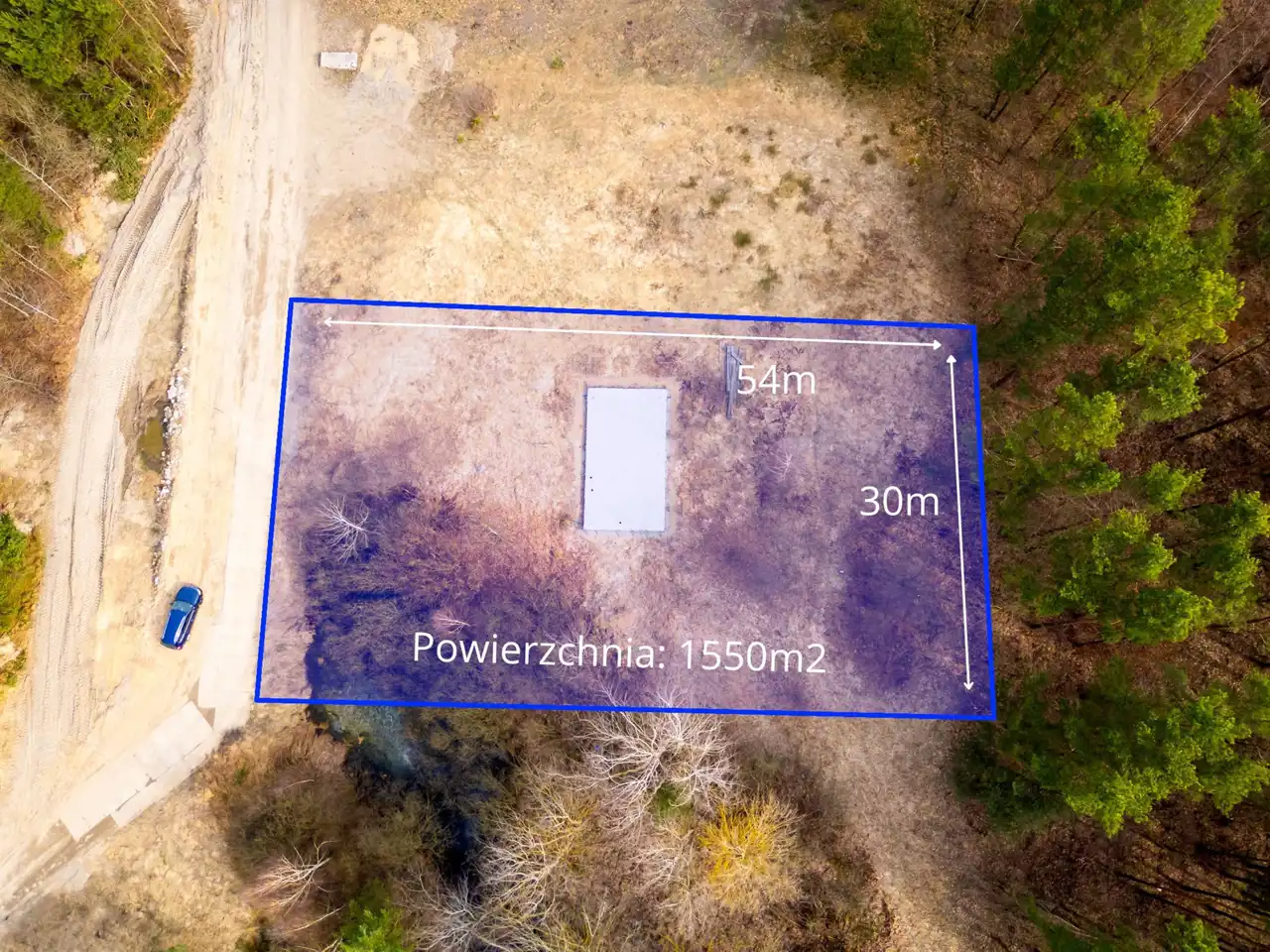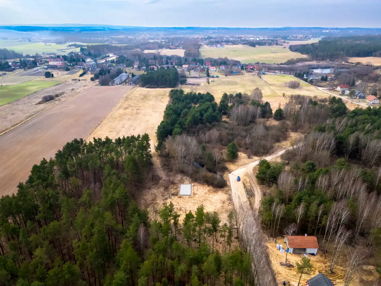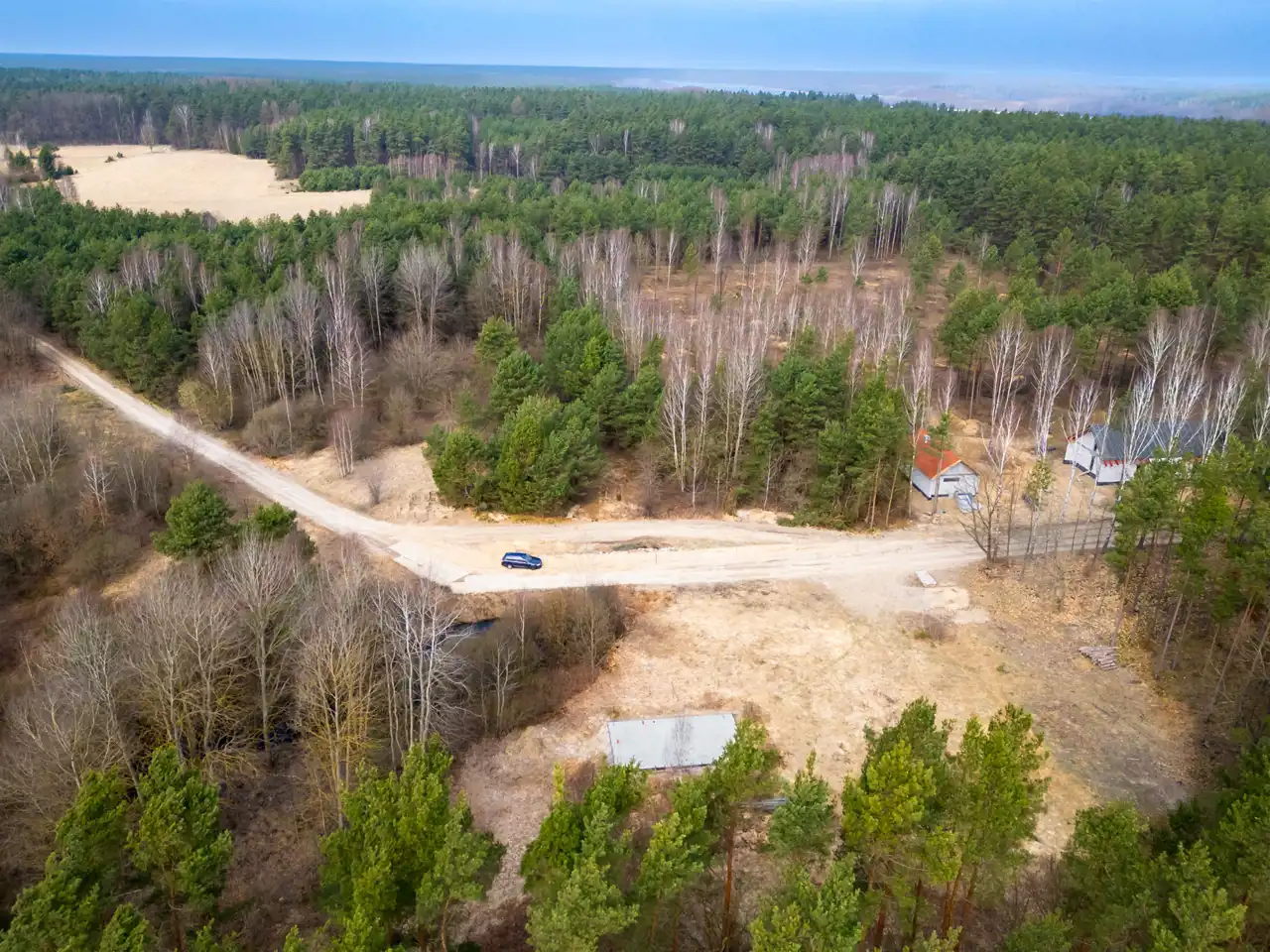 Sama działka również ma ogromny atut: teren jest równy, co daje wygodę przy dalszej realizacji inwestycji i zagospodarowaniu przestrzeni. Dodatkowo nieruchomość otoczona jest lasami, dzięki czemu to miejsce daje coś, czego dziś szuka coraz więcej osób — ciszę, prywatność i prawdziwy oddech od codziennego tempa.