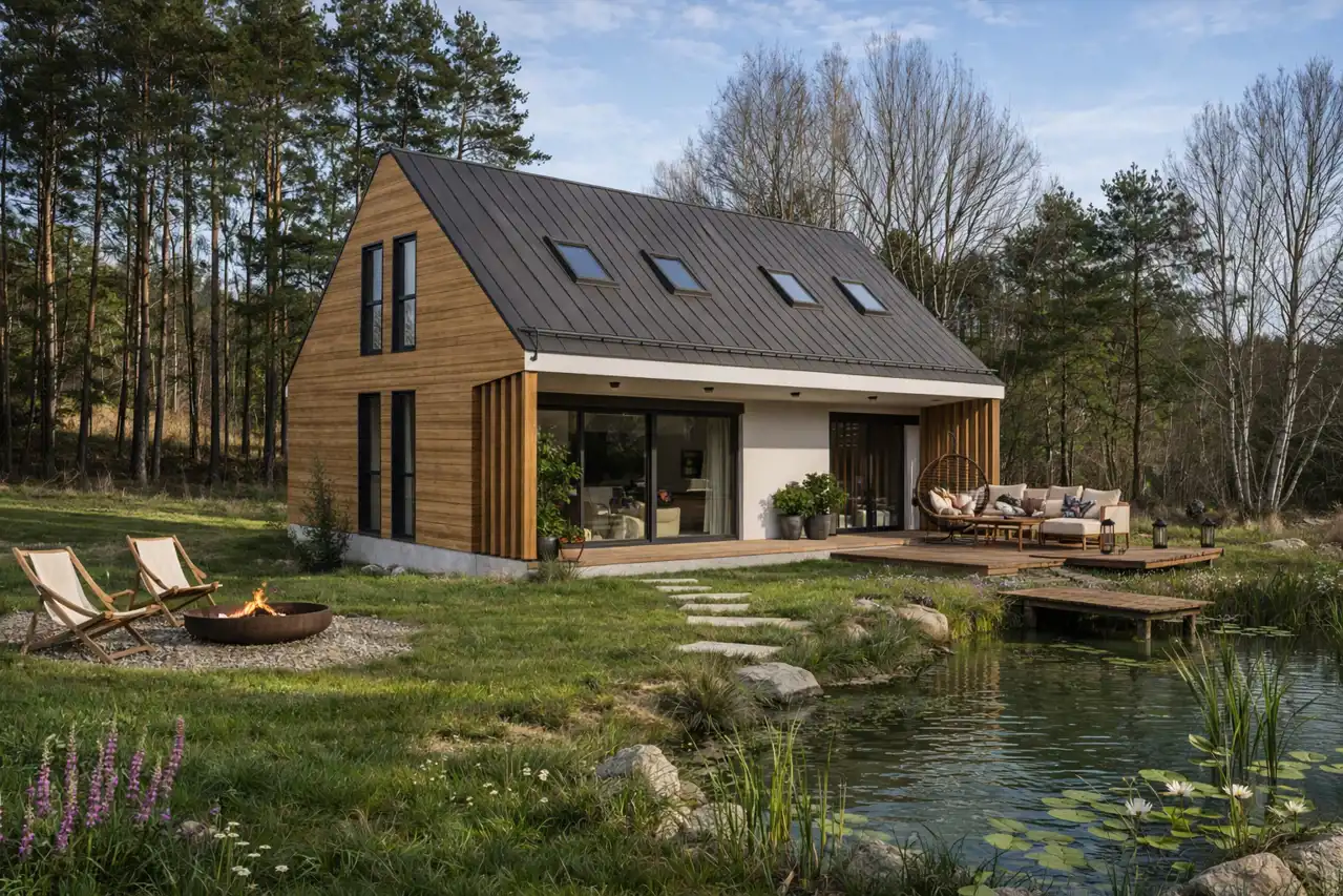 Dla nieruchomości przygotowano projekt Grot Drewniany — klimatycznego domu o powierzchni użytkowej 87,82 m², który idealnie wpisuje się w charakter tej lokalizacji. To projekt łączący przytulność, funkcjonalność i ponadczasowy styl. Duże przeszklenia, otwarta strefa dzienna, wygodne pokoje i zadaszona weranda tworzą przestrzeń, w której równie dobrze można mieszkać na co dzień, jak i odpoczywać przez cały rok.