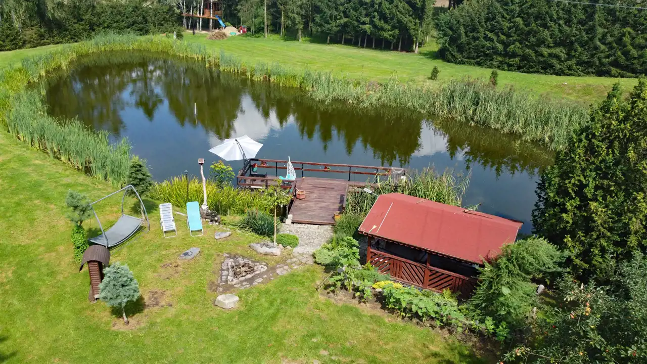 Na terenie działki znajdują się dwa duże, pięknie zagospodarowane, zarybione stawy, jeden o głębokości 4 metrów, a drugi 8 metrów. Oba stawy posiadają urokliwe pomosty, idealne do relaksu i wędkowania.