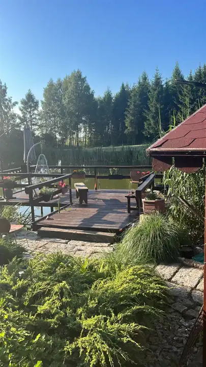 Posesja jest ogrodzona, posiada 3 bramy wjazdowe, zagospodarowana, częsciowo zalesiona. Znajdują się na niej 2 urządzone stawy z pomostem, altanką i miejscem na grilla.Teren jest osłonięty od sąsiednich posesji co daje poczucie prywtności i spokojnego wypoczynku.