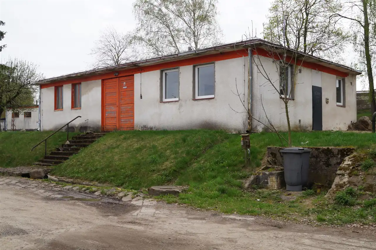 - budynek socjalny - biuro, szatnia, natryski, wc, umywalki (po gruntownym remoncie) połączony z garażem na jedno stanowisko,
