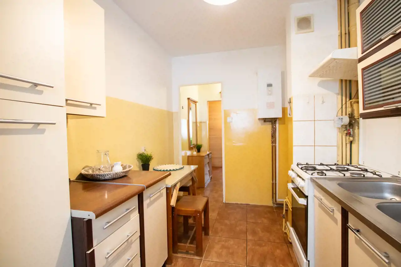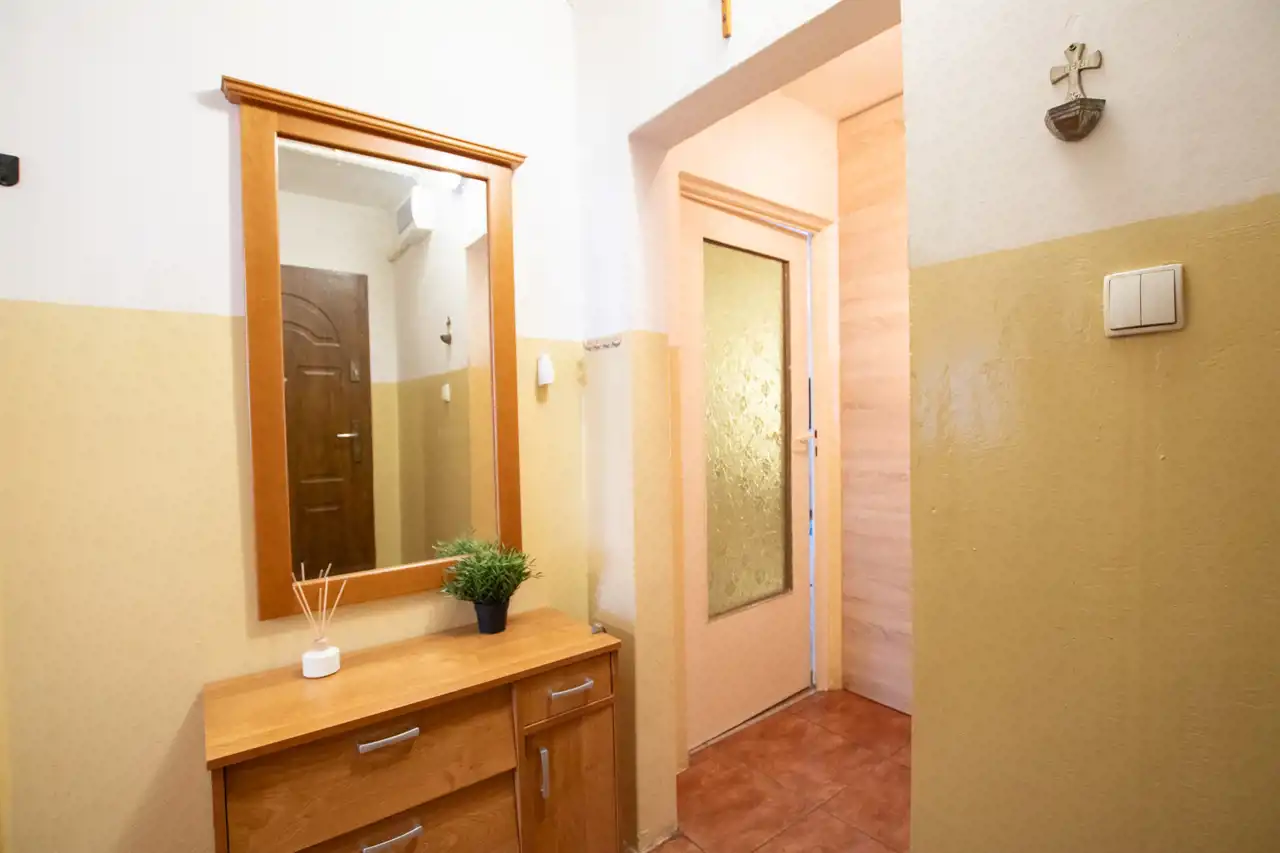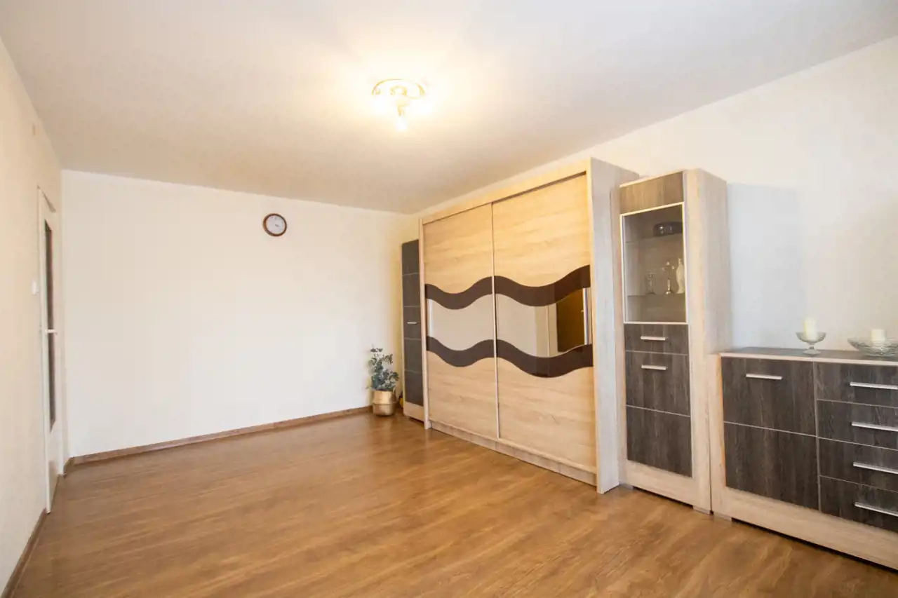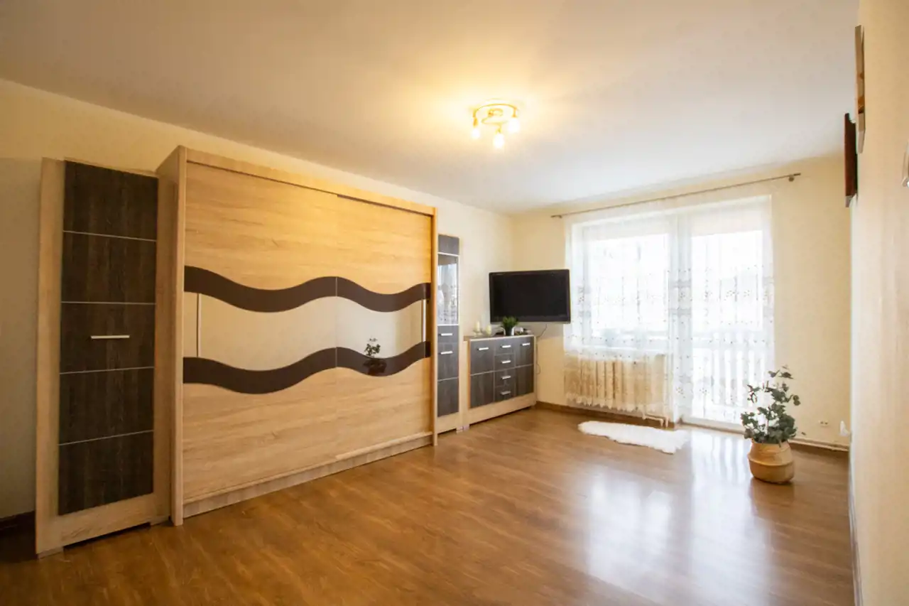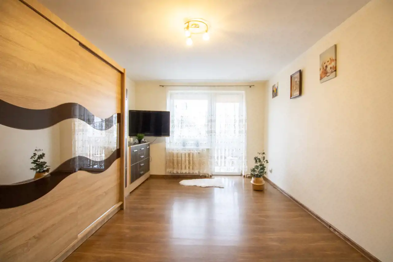 - Pokój 1: duży przestronny salon z wyjściem na balkon, gdzie jest miejsce na kącik wypoczynkowy, dużą szafę, zestaw RTV czy stół z krzesłami