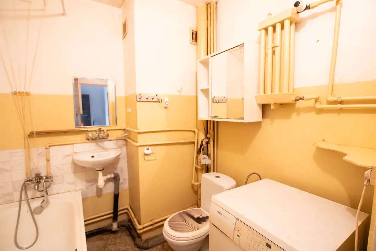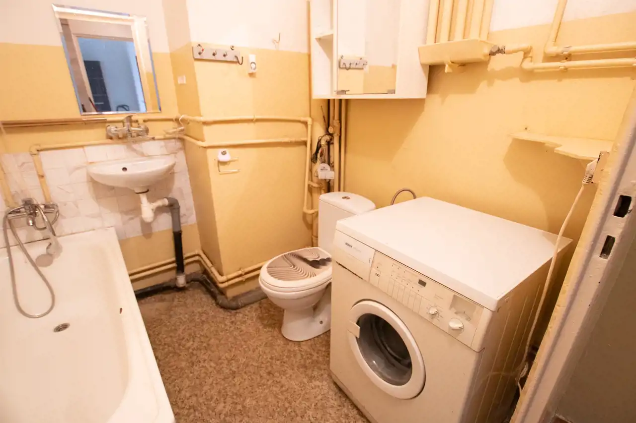 - Łazienka: znajduję się tutaj wanna, zlewozmywak, toaleta, pralka i szafki