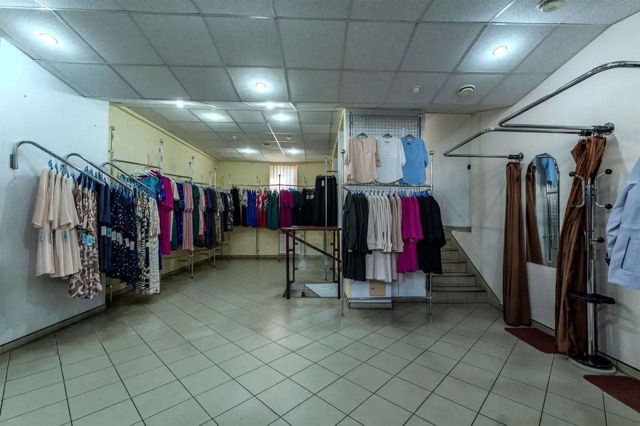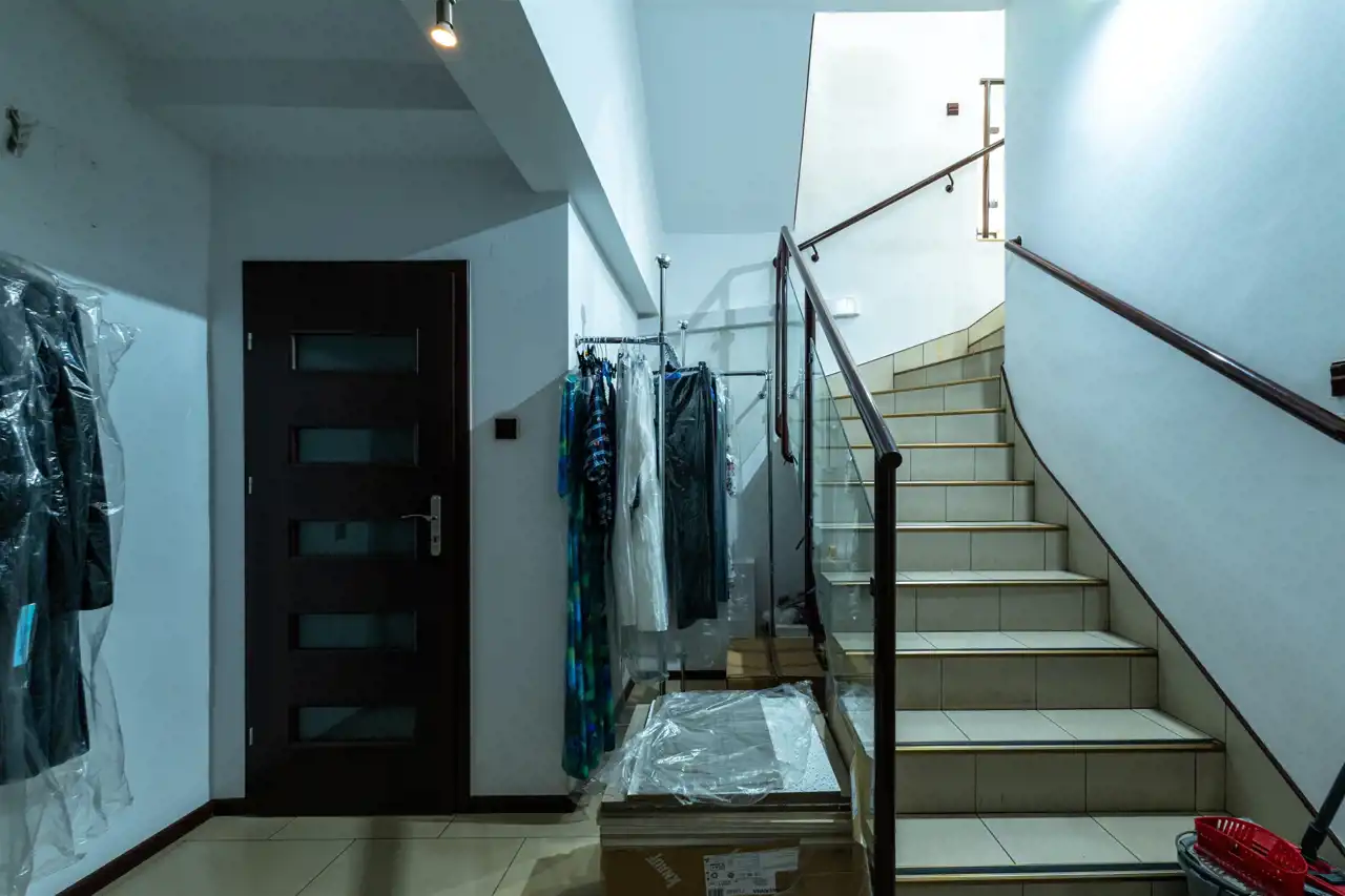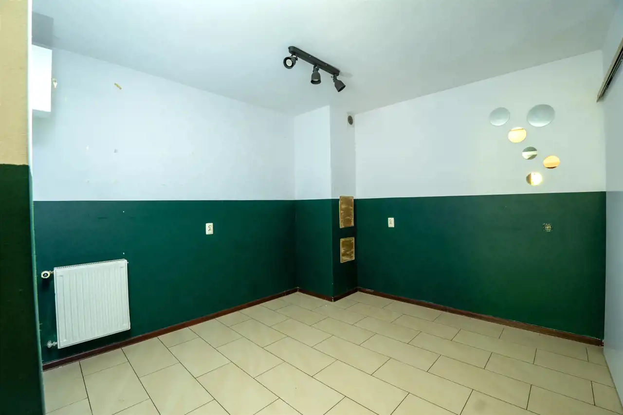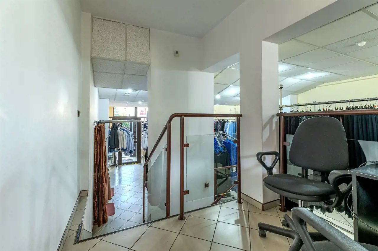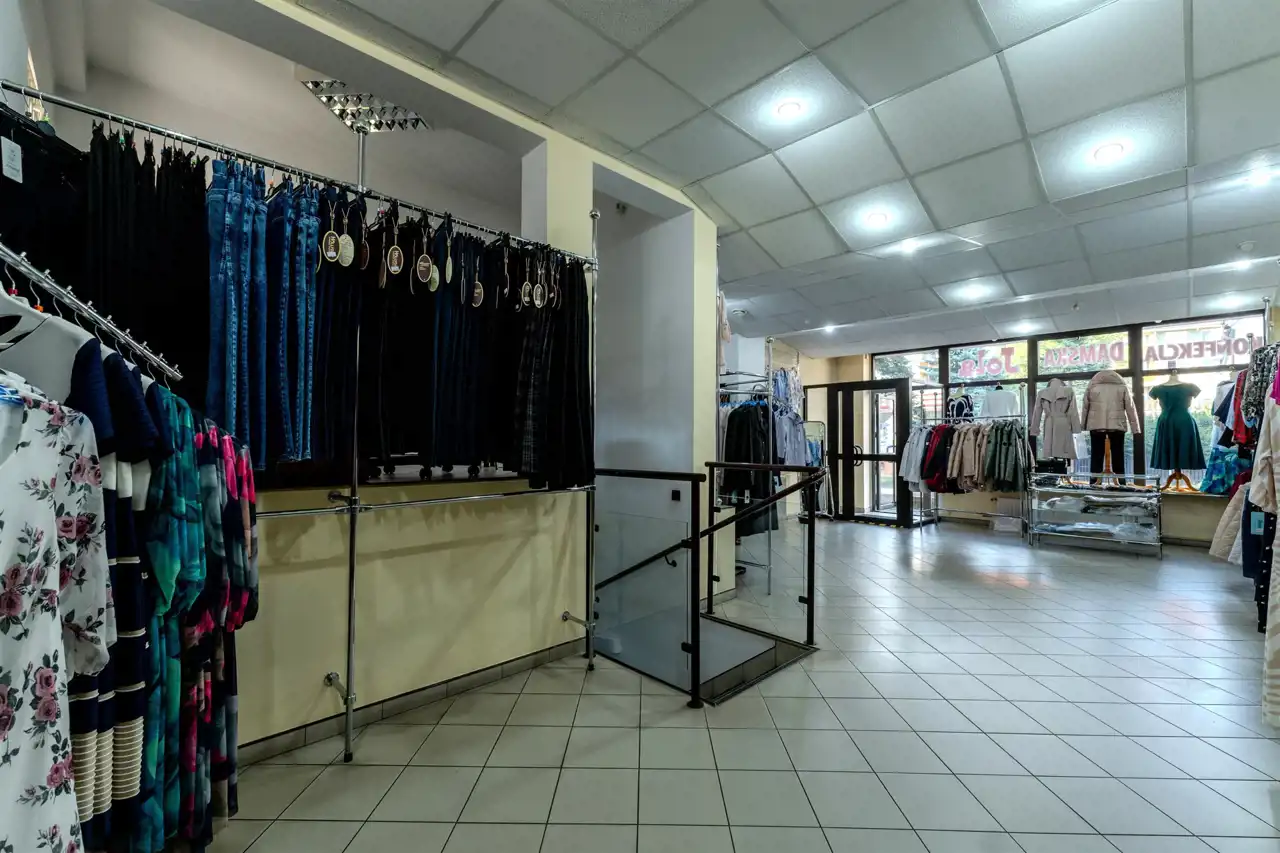 Pierwszy lokal o powierzchni 74 m² ma wejście od strony ulicy Grunwaldzkiej. Składa się z dużej sali sprzedażowej (ponad 50 m²) z dużymi witrynami, które przyciągają uwagę przechodniów. W centralnej części zaaranżowano praktyczne miejsce biurowe na podwyższeniu – idealne dla obsługi klientów lub jako punkt nadzoru nad całą przestrzenią. Z parteru prowadzą schody do części piwnicznej, gdzie znajduje się zaplecze magazynowe i pomieszczenie sanitarne z WC, a także dodatkowe wyjście na dziedziniec.